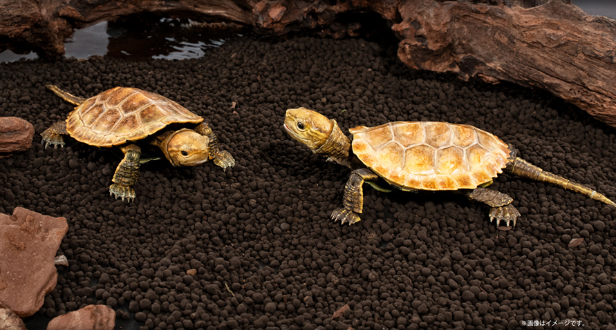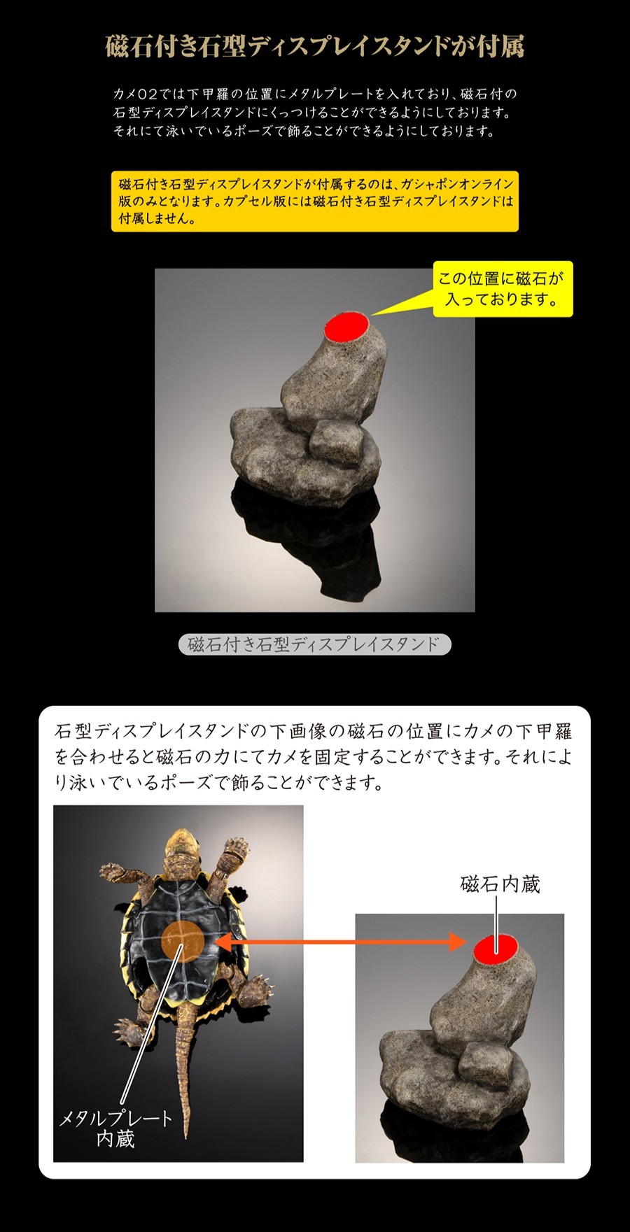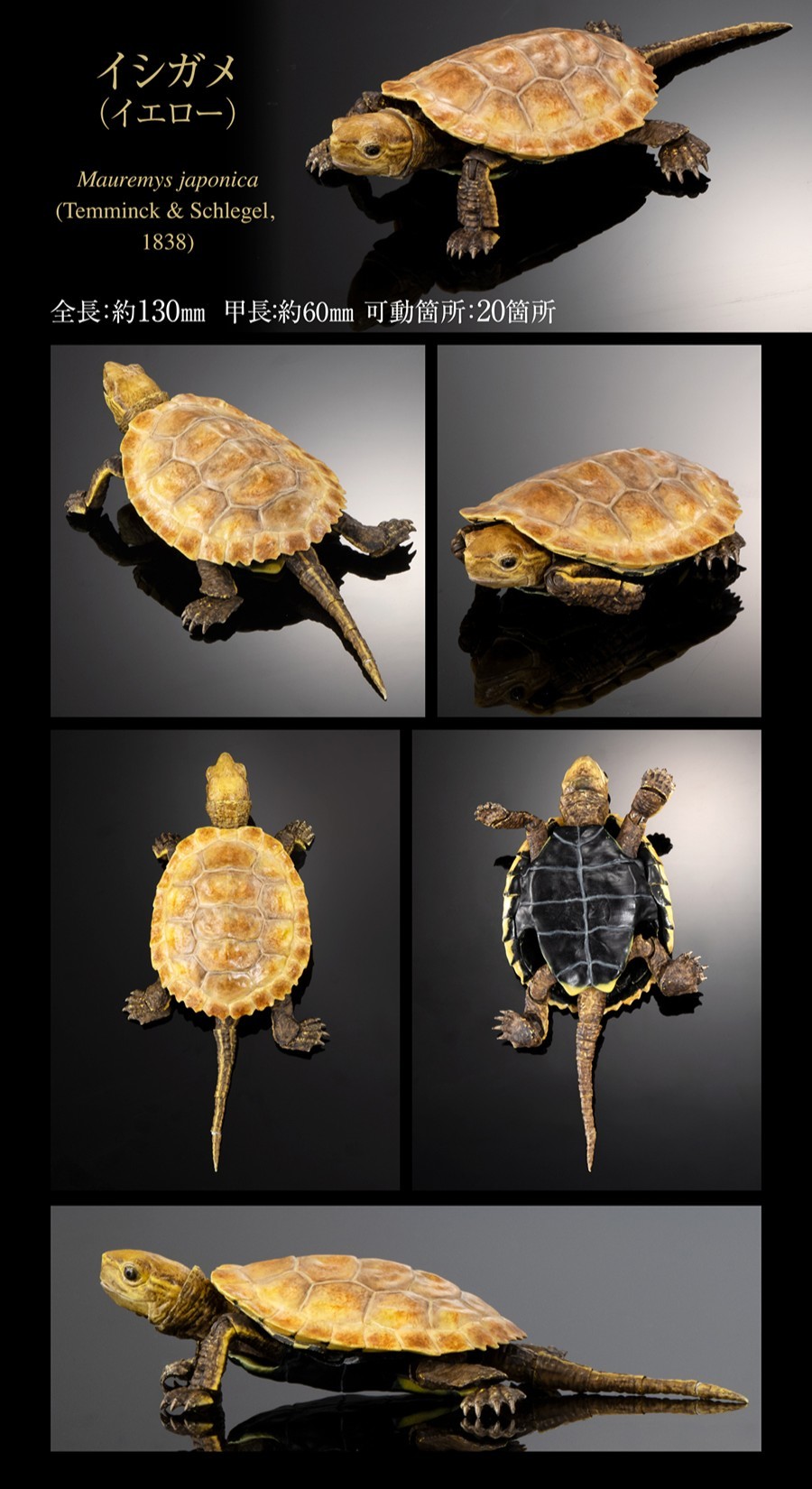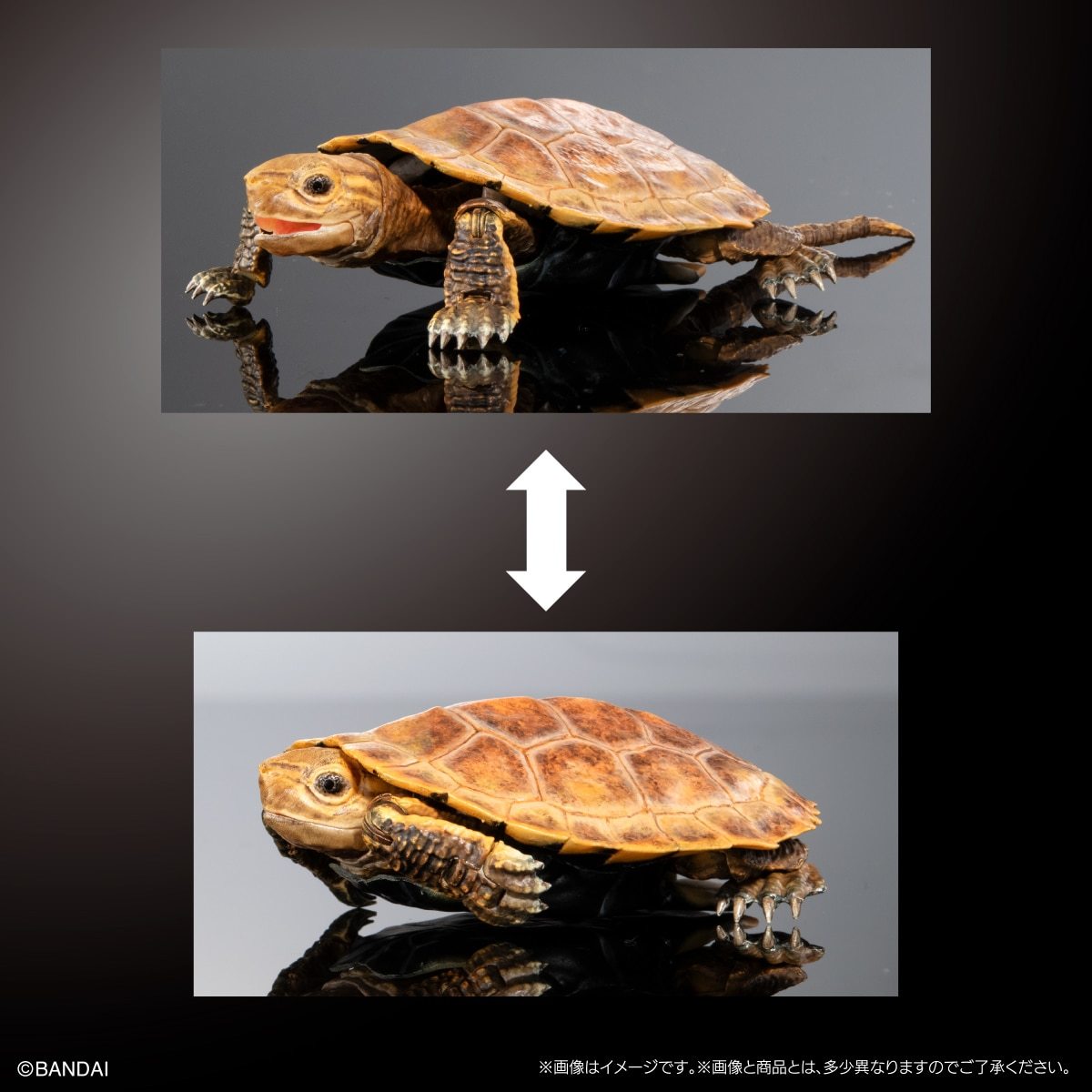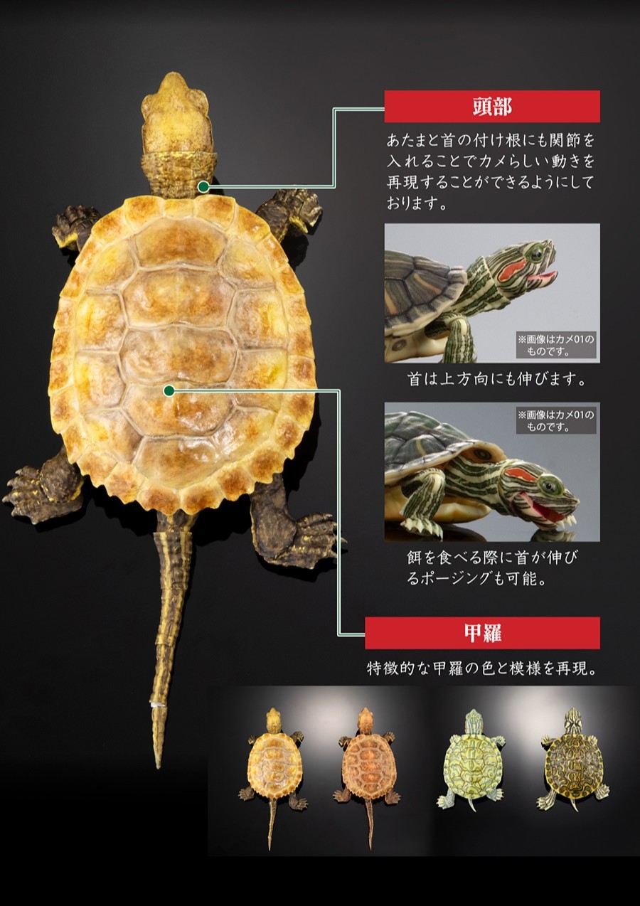 尺寸達 100 ~ 130 mm(甲殼長約 60mm),並有 16 ~ 20 處可動關節,部分採用軟材質,更加入新規構造,可以徹底實現將頭部與四肢縮入龜殼內的模樣;頸部新增的關節也能賞玩烏龜吃東西時脖子伸展的姿勢!特徵的甲殼逼真還原複雜的紋理和色彩,除此之外,在腹部還內藏有磁鐵設計,能與套組的石頭型展示架相吸,重現烏龜爬上石頭的狀態,展示烏龜伸展手腳的可愛造型~帶去戶外或是在飼養箱裡拍照也能較為不受限制地擺出豐富的情境。