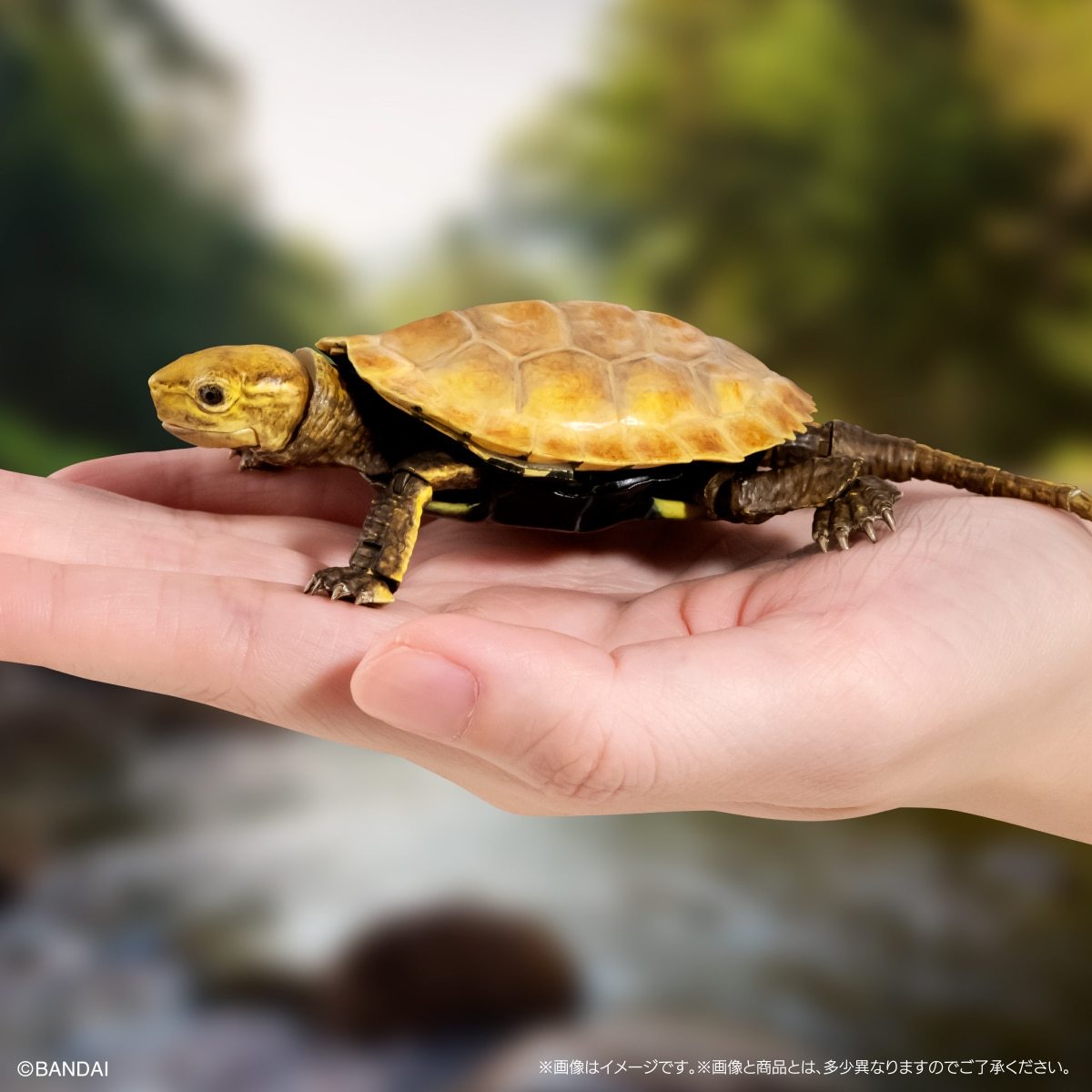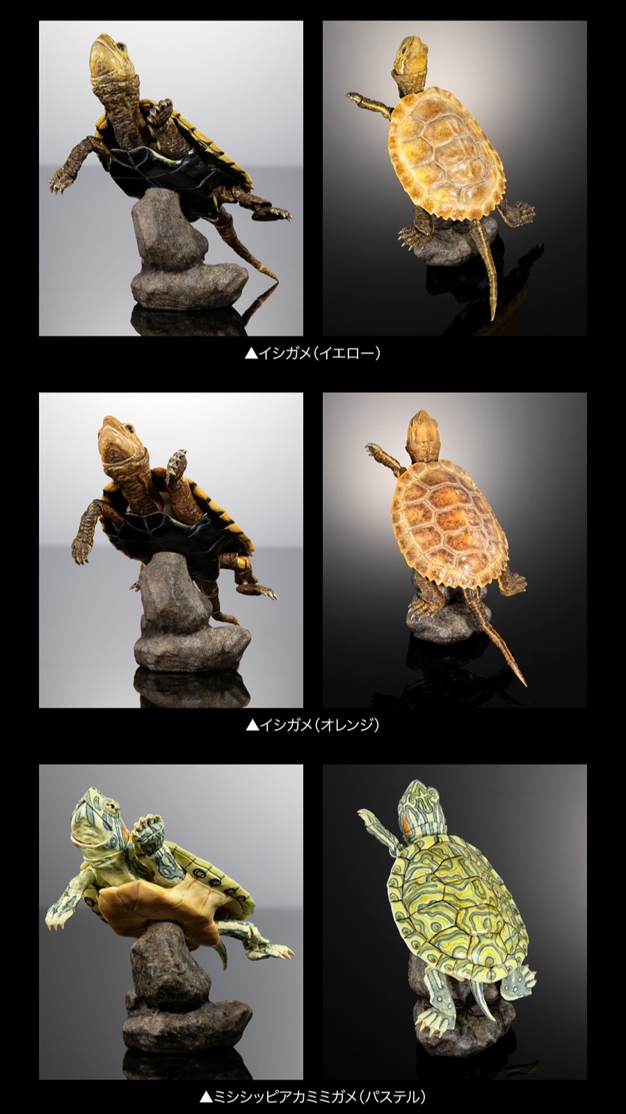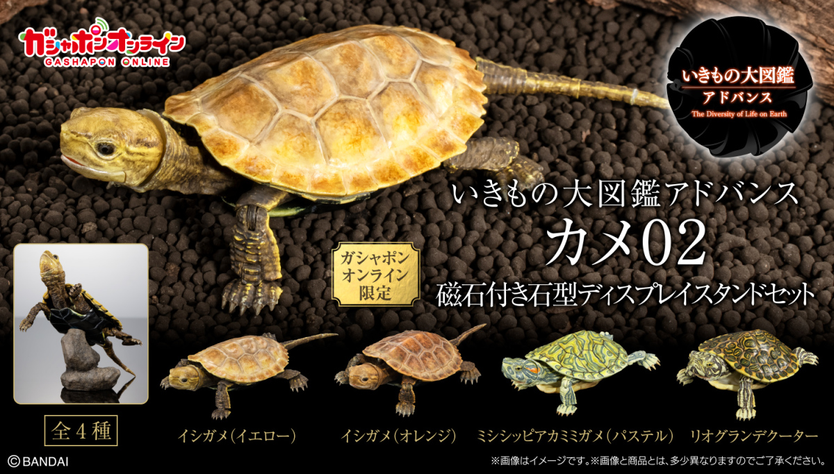 擁有最頂級的尺寸、造型與可動設計的「生物大圖鑑Ultimate(いきもの大図鑑アドバンス)」,相較「生物大圖鑑」系列,商品更具擬真細節和精緻塗裝。本次推出的「生物大圖鑑Ultimate 烏龜02 磁吸石頭型展示架套組」,由 KAME HOUSE 的佐藤真啓老師擔任原型,徹底再現烏龜幼體造型與生物構造;並由田中寬晃老師負責塗裝,施以壓倒性的生物色彩!收錄有:日本石龜(黃色)、日本石龜(橘色)、紅耳龜(巴西龜)、格蘭德偽龜(大和甜甜圈龜)四種款式。