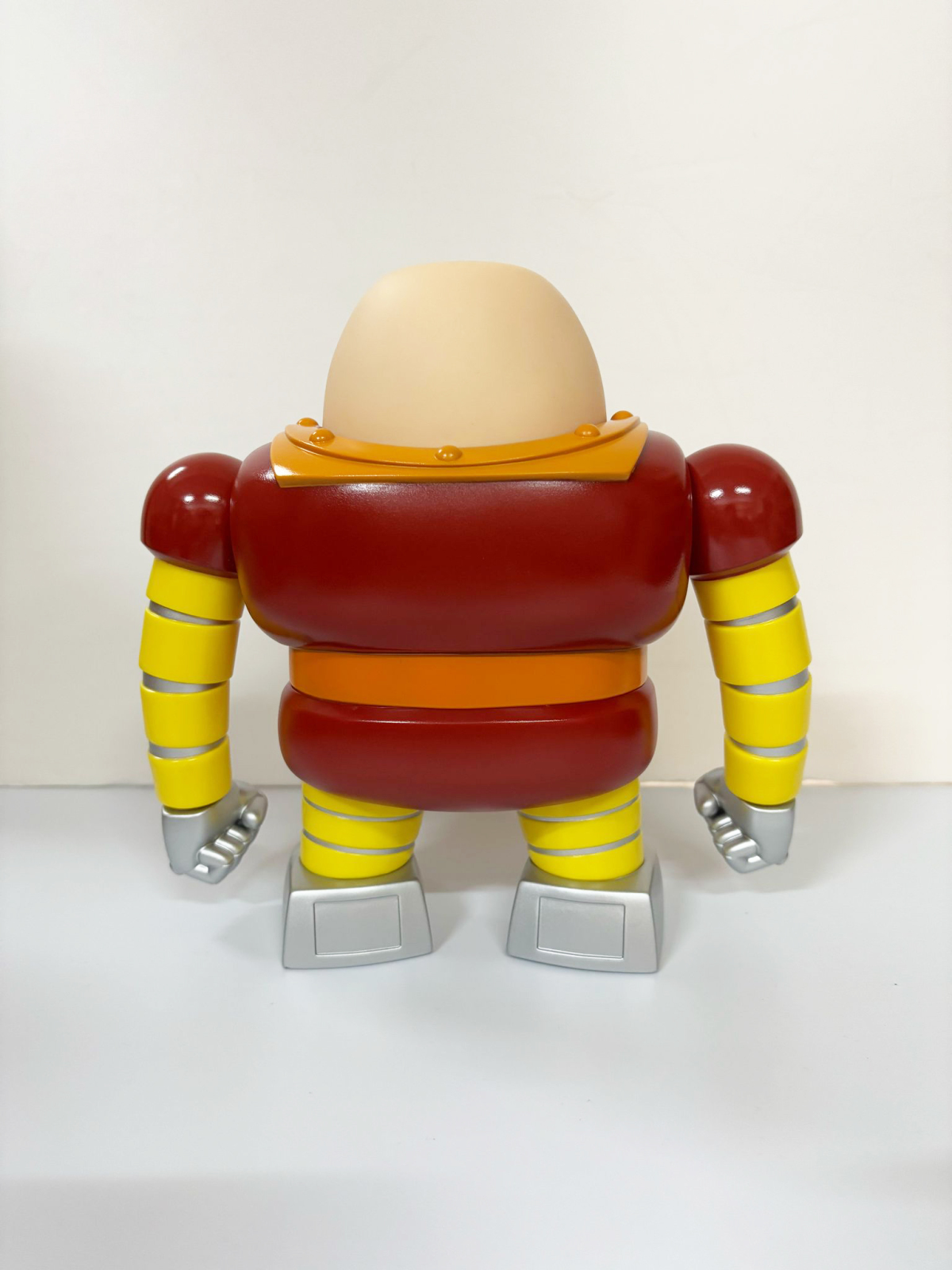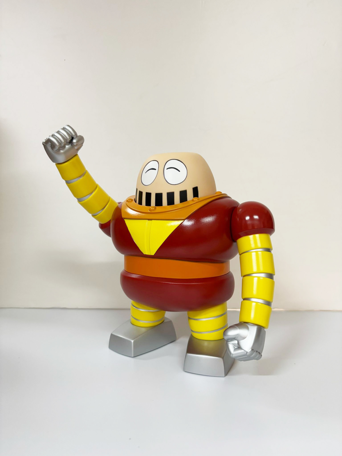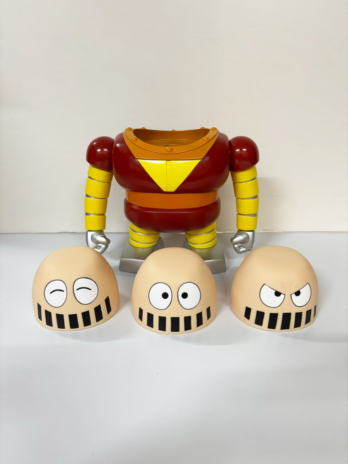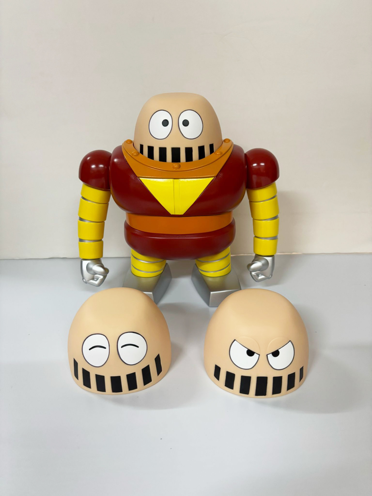 尺寸約高 22CM,還原個性可愛的外型。頭部表情有普通臉、生氣臉、笑臉三種替換,並透過磁吸與本體組合,劇中將頭部拿下來的造型也可以再現,手部可動,賞玩滑稽趣味的大鐵牛 !
