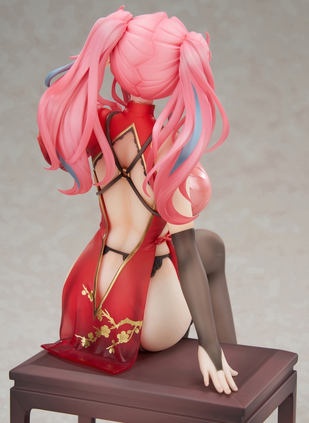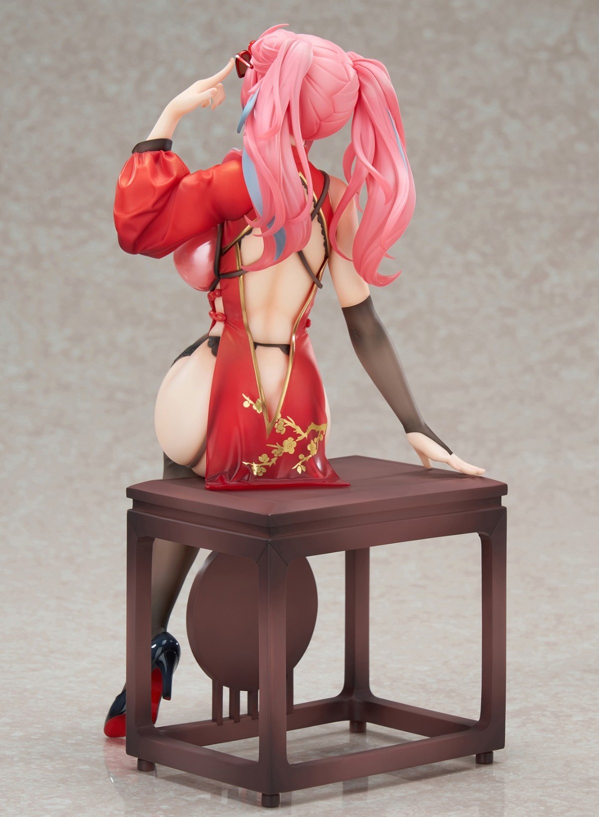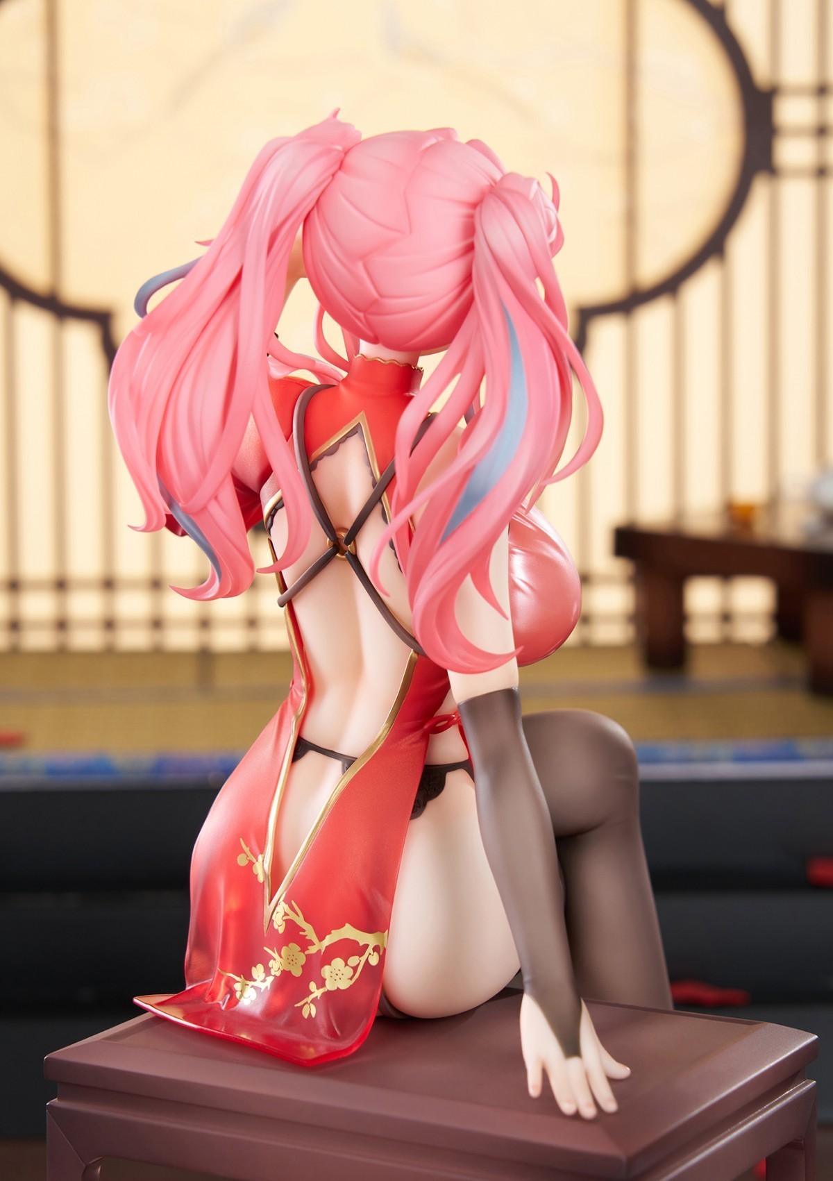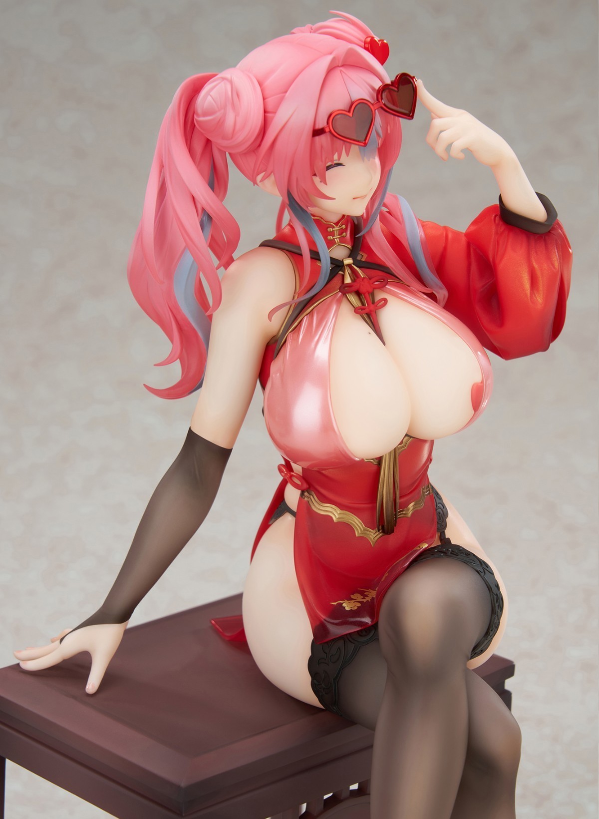 「APEX-TOYS 碧藍航線 布萊默頓 插畫Ver.」1/7 比例模型,尺寸約高 22 公分,還原新春插畫中布萊默頓穿著旗袍的性感造型!特徵的粉色長髮綁成可愛的小包子雙馬尾,瀟灑坐在木凳上,手指輕輕扶著時髦的愛心墨鏡並魅力眨眼~大膽露出豐滿身材的旗袍,雙峰呼之欲出!施以珠光塗裝讓飽滿的曲線在光線折射下更具立體感;黑色絲襪營造出若隱若現的透膚質感,與白皙肌膚形成對比~加上背後的漸層透明材質與黑色綁帶...讓整體充滿魅惑挑逗!
