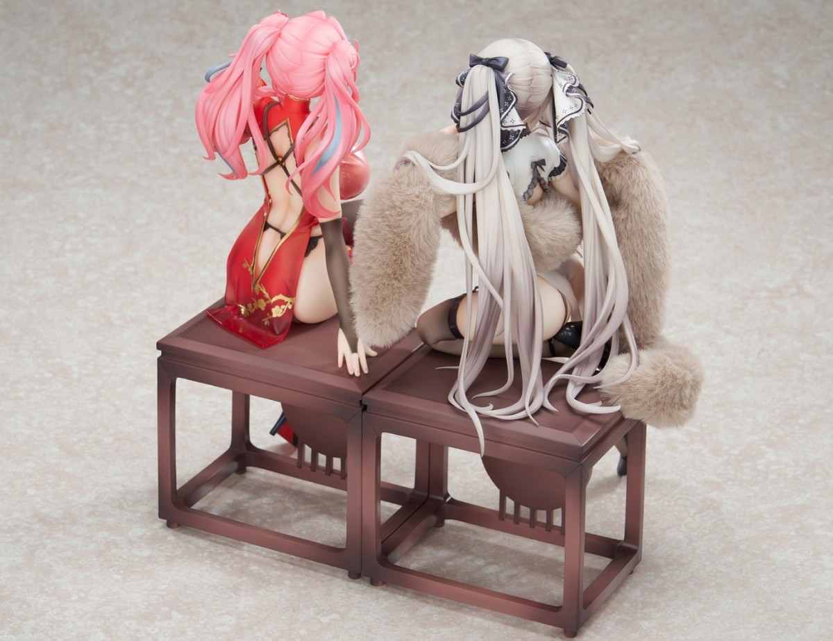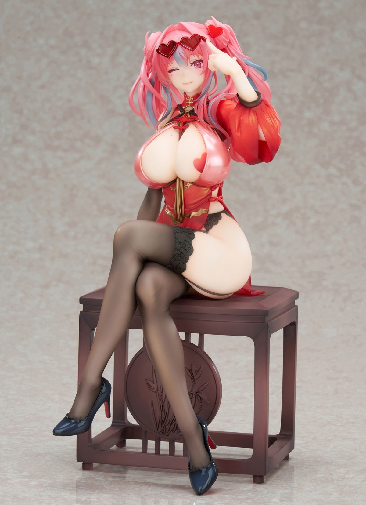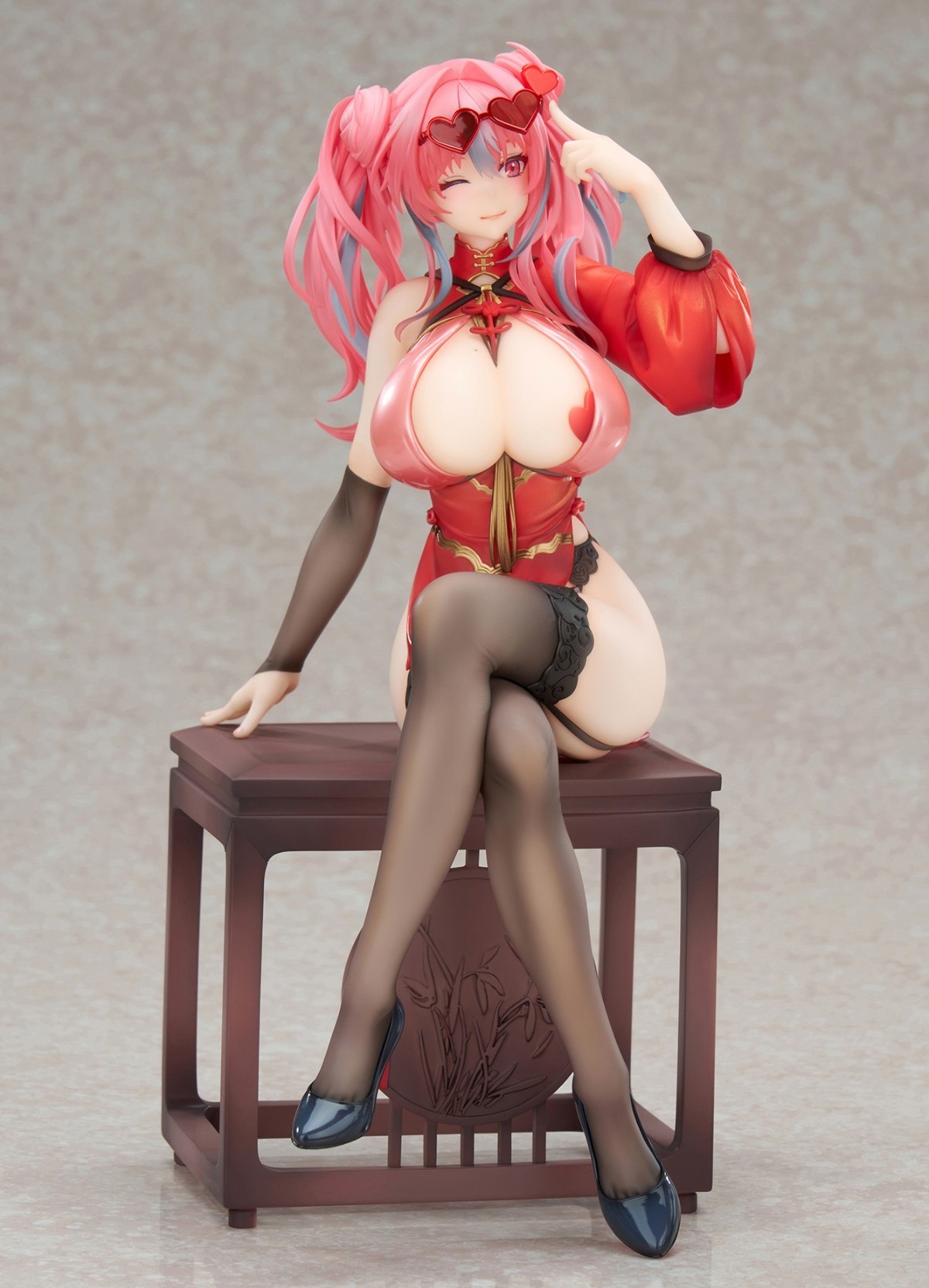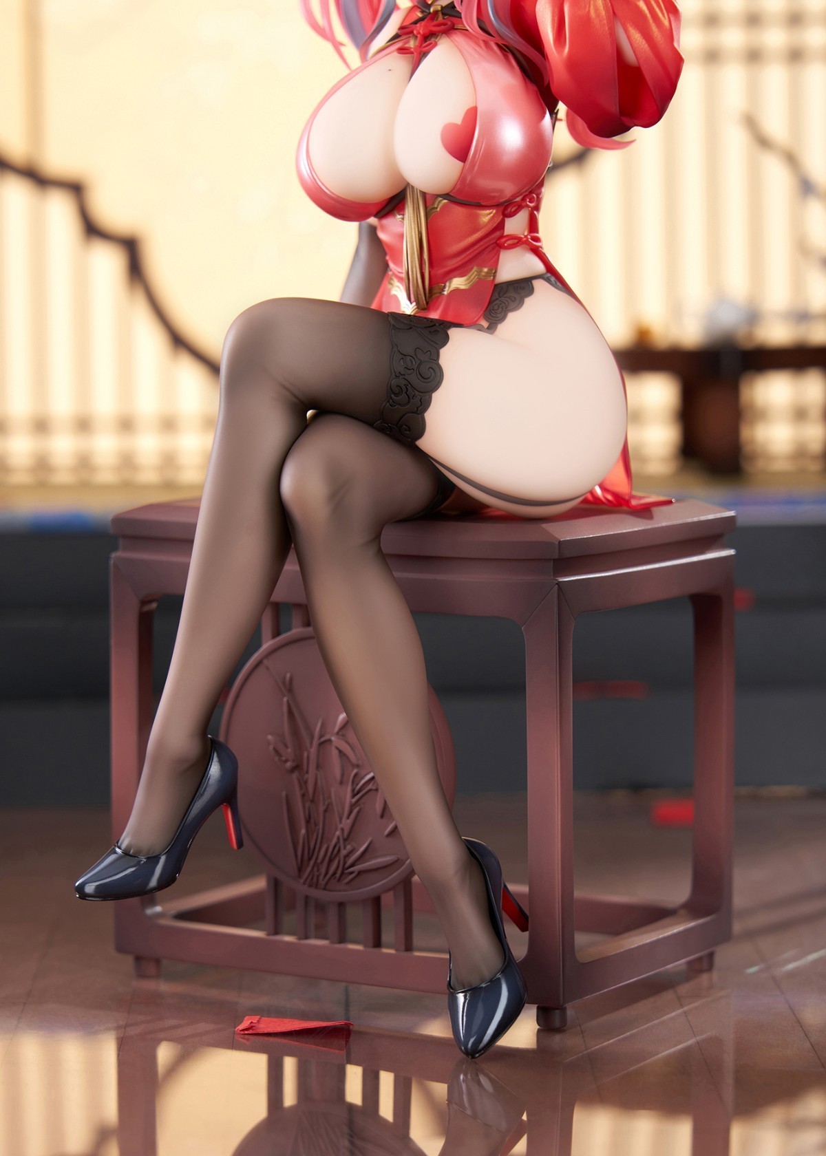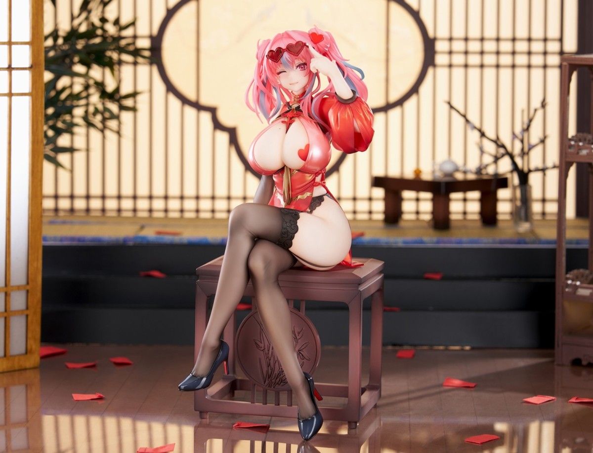 「APEX-TOYS 碧藍航線 布萊默頓 插畫Ver.」1/7 比例模型,尺寸約高 22 公分,還原新春插畫中布萊默頓穿著旗袍的性感造型!特徵的粉色長髮綁成可愛的小包子雙馬尾,瀟灑坐在木凳上,手指輕輕扶著時髦的愛心墨鏡並魅力眨眼~大膽露出豐滿身材的旗袍,雙峰呼之欲出!施以珠光塗裝讓飽滿的曲線在光線折射下更具立體感;黑色絲襪營造出若隱若現的透膚質感,與白皙肌膚形成對比~加上背後的漸層透明材質與黑色綁帶...讓整體充滿魅惑挑逗!