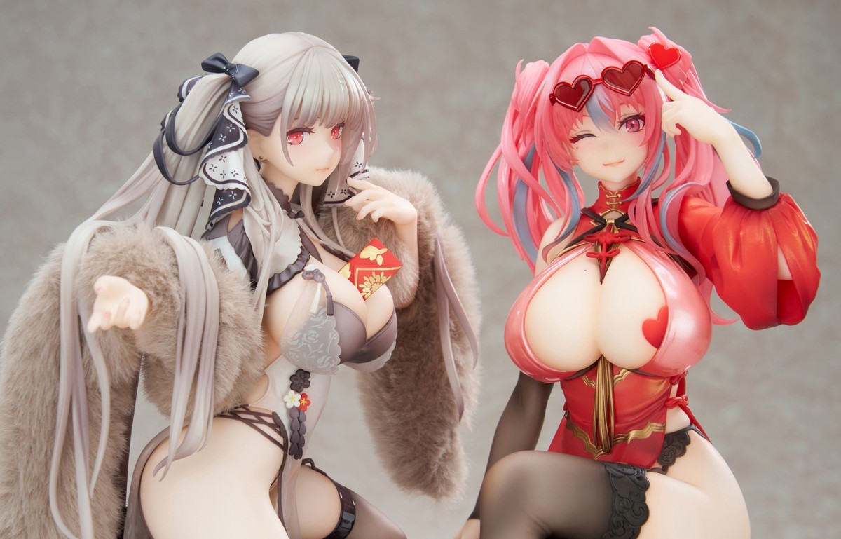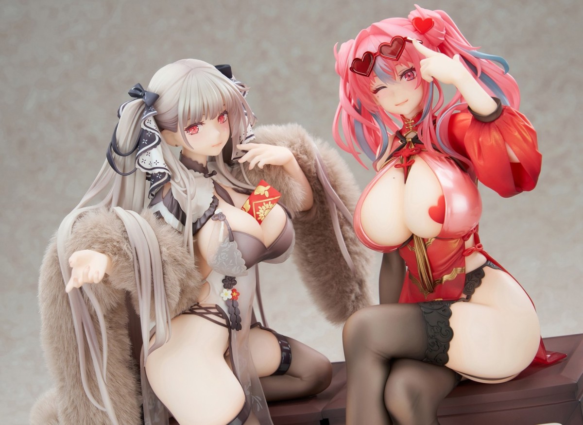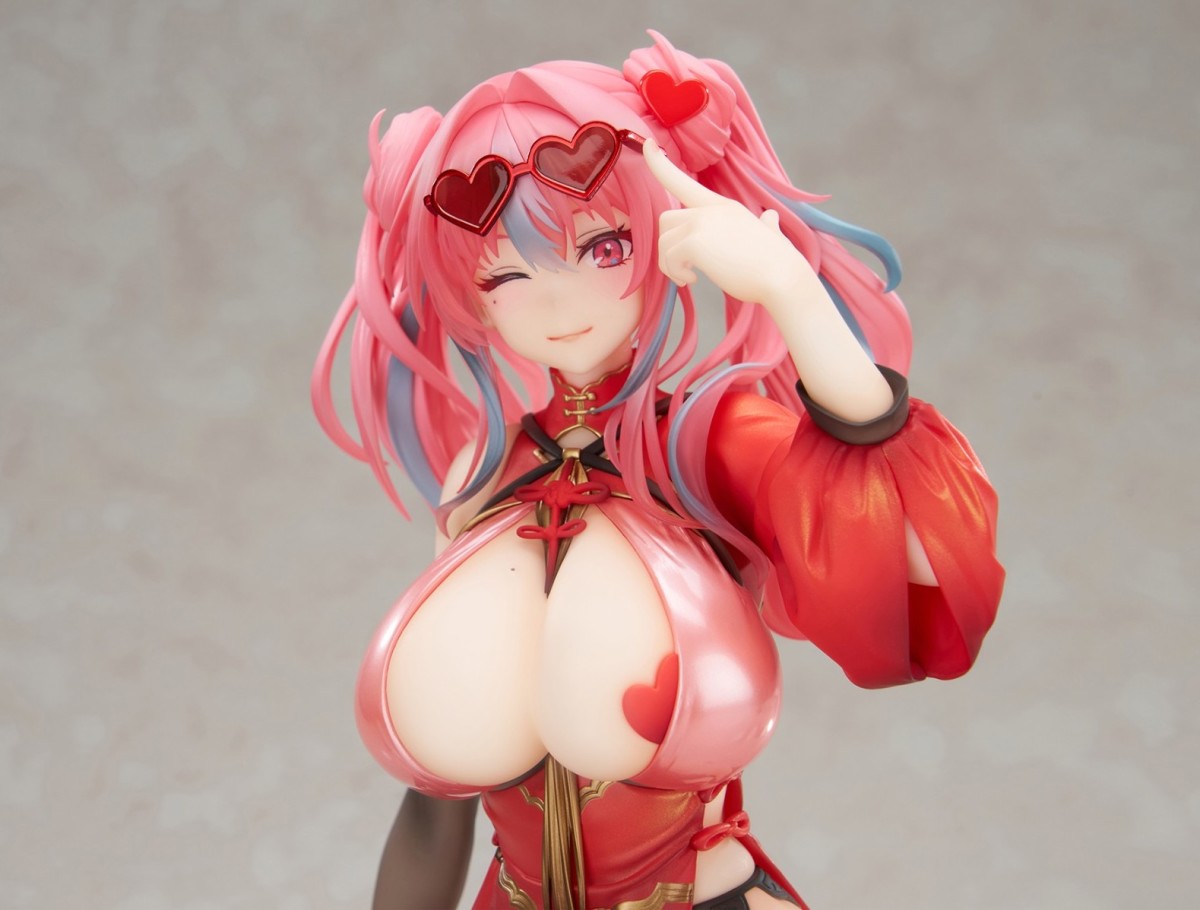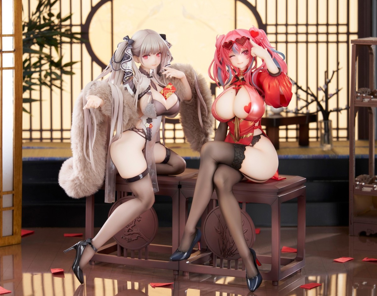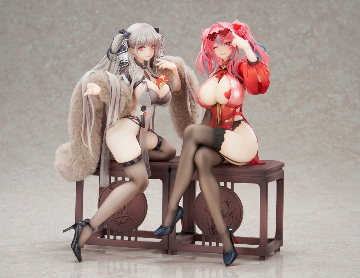 「APEX-TOYS 碧藍航線 布萊默頓 插畫Ver.」1/7 比例模型,尺寸約高 22 公分,還原新春插畫中布萊默頓穿著旗袍的性感造型!特徵的粉色長髮綁成可愛的小包子雙馬尾,瀟灑坐在木凳上,手指輕輕扶著時髦的愛心墨鏡並魅力眨眼~大膽露出豐滿身材的旗袍,雙峰呼之欲出!施以珠光塗裝讓飽滿的曲線在光線折射下更具立體感;黑色絲襪營造出若隱若現的透膚質感,與白皙肌膚形成對比~加上背後的漸層透明材質與黑色綁帶...讓整體充滿魅惑挑逗!
