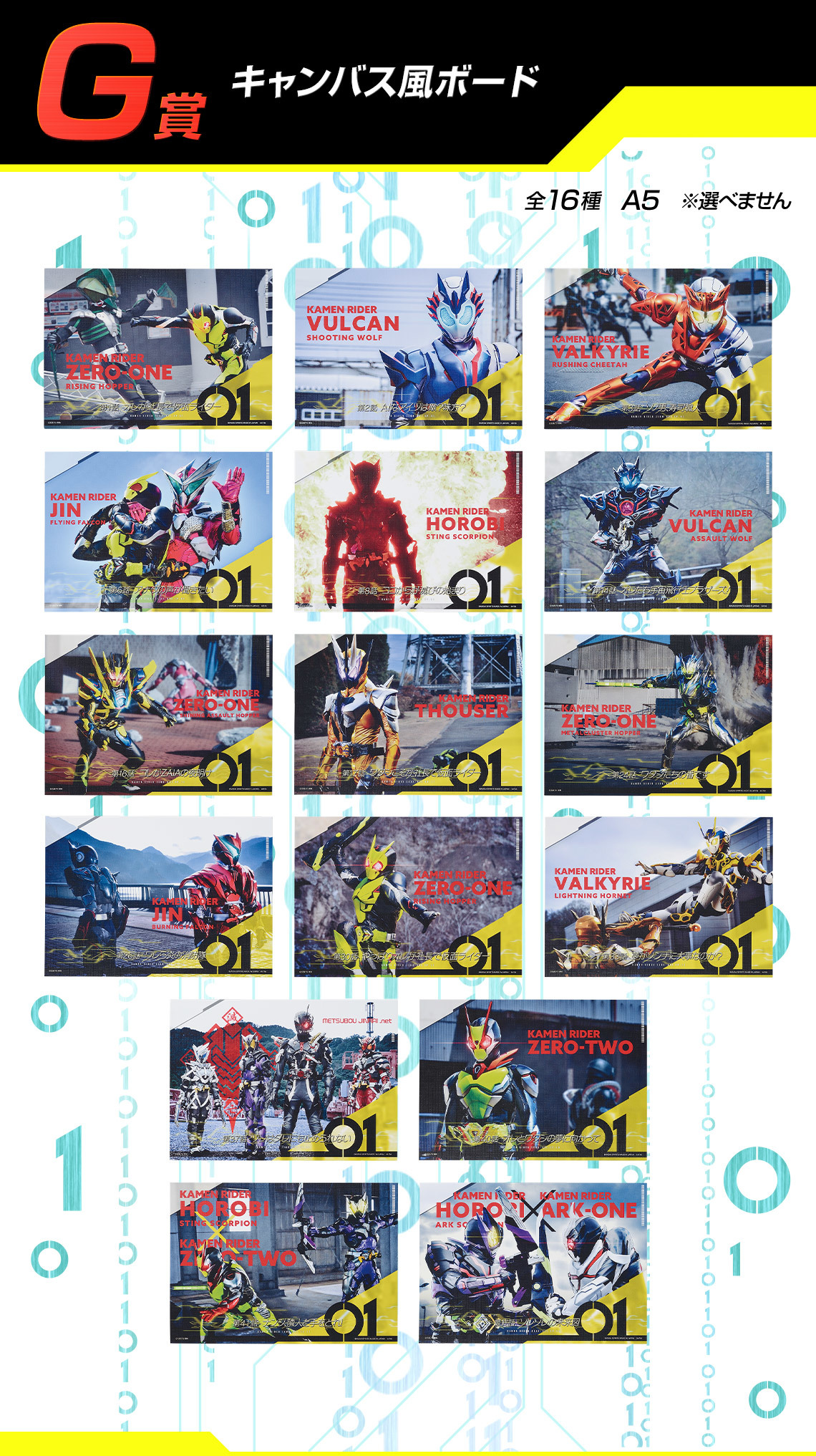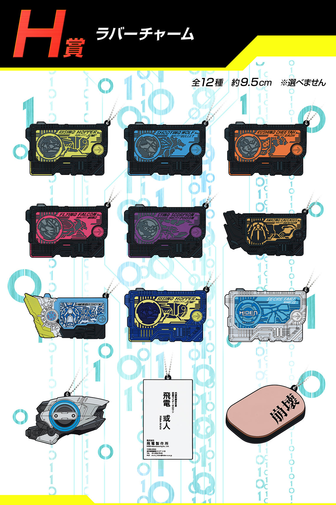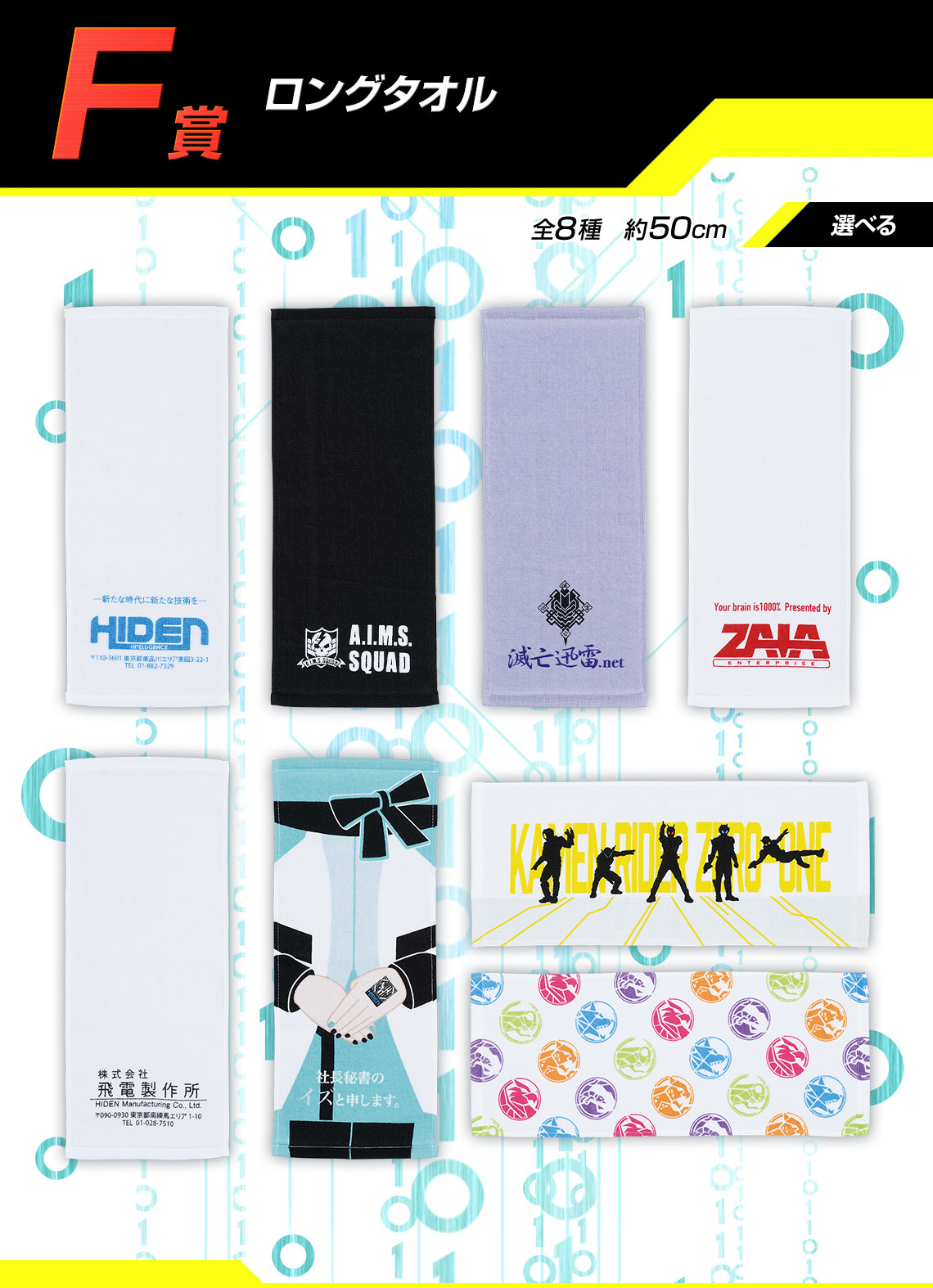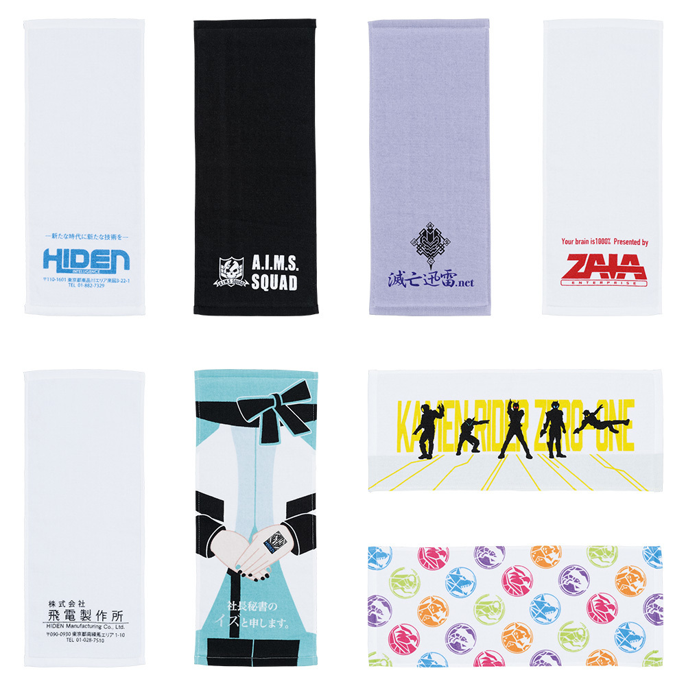 F賞的長毛巾靈感來自劇中的組織和企業,並參考了影集整體的美術風格打造;G賞的帆布風版畫採用了各集的精彩劇照搭配獨特的平面美術重現像是每集結束在看預告的效果;H賞則是將劇中的多個數據鑰匙、飛電或人的名片、腹筋崩壞太郎的腹筋等各種有趣物件製作成橡膠吊飾!每一款賞品都充分的展現了ZERO-ONE世界觀的魅力!