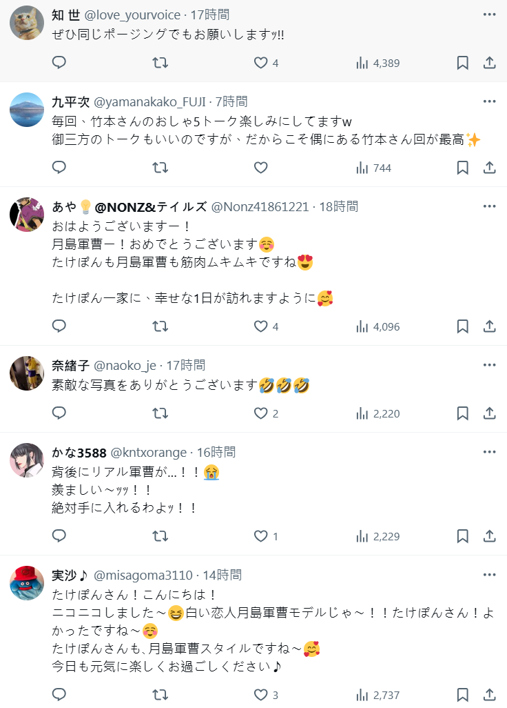 雖然照片有打馬賽克,但粉絲們還是嗨翻,紛紛留言:「一模一樣!」「這根本是自我重現吧!」甚至還有人笑說:「我們到底在看什麼東西?!」,讓人見識到竹本滿滿的幽默與敬業精神。