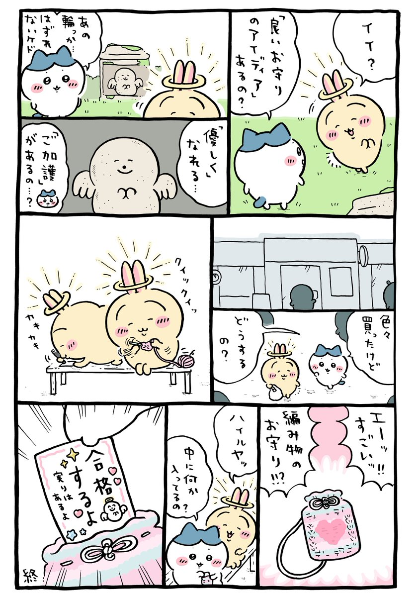 有在追連載漫畫的朋友一定對這一集印象深刻,因為被神秘祠堂的天使光環套上的兔兔,突然變成溫柔體貼的樣貌。因為小八原本跟兔兔在商討如何替迎來「除草檢定5級」考試的吉伊加油打氣,結果性情大變的兔兔就買了毛線親手織了一個御守,還附上卡片祈願考試合格。