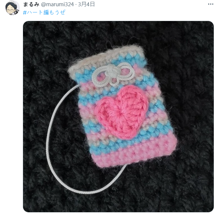 沒想到漫畫才上架沒多久,推主ユーフォ( @bon_66 ) 就手織嘗試,白色、淺藍色與粉色的條紋搭配深粉紅色的愛心,細節還原度超高,跟動畫裡的幾乎一模一樣!博得網友大讚。