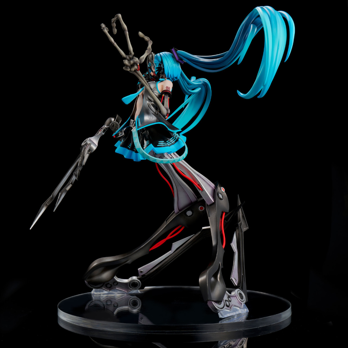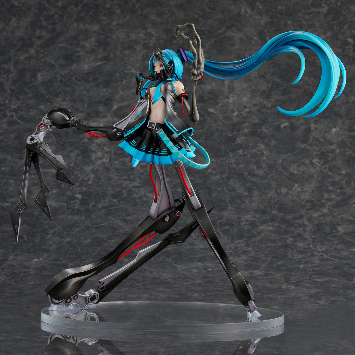 Union Creative『骸音鈣15th Memorial』1/7模型,以豪華規格打造,採用高約 26 公分的分量尺寸呈現,最大限度地展現了骸音鈣的獨特魅力!還原在插畫中極為不平衡的衝擊造型,細膩刻劃出銳利冰冷的機械義肢,與身體銜接的管線、堅硬的金屬質感都十分逼真;穿著初音標誌性的藍綠色雙馬尾與服裝,臉部和身體則是施以柔軟的膚質塗裝,對比嘴部如蜘蛛腳般的機械臂,形成強烈反差。擺飾起來極具存在感!