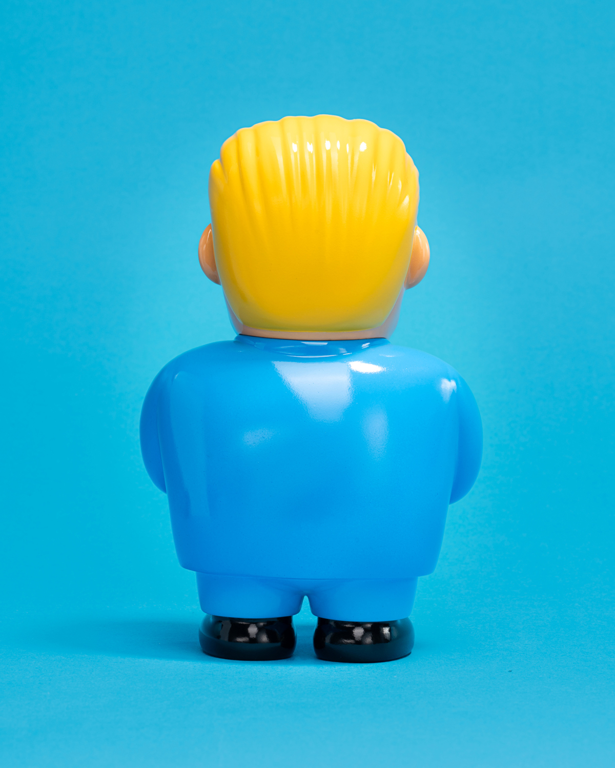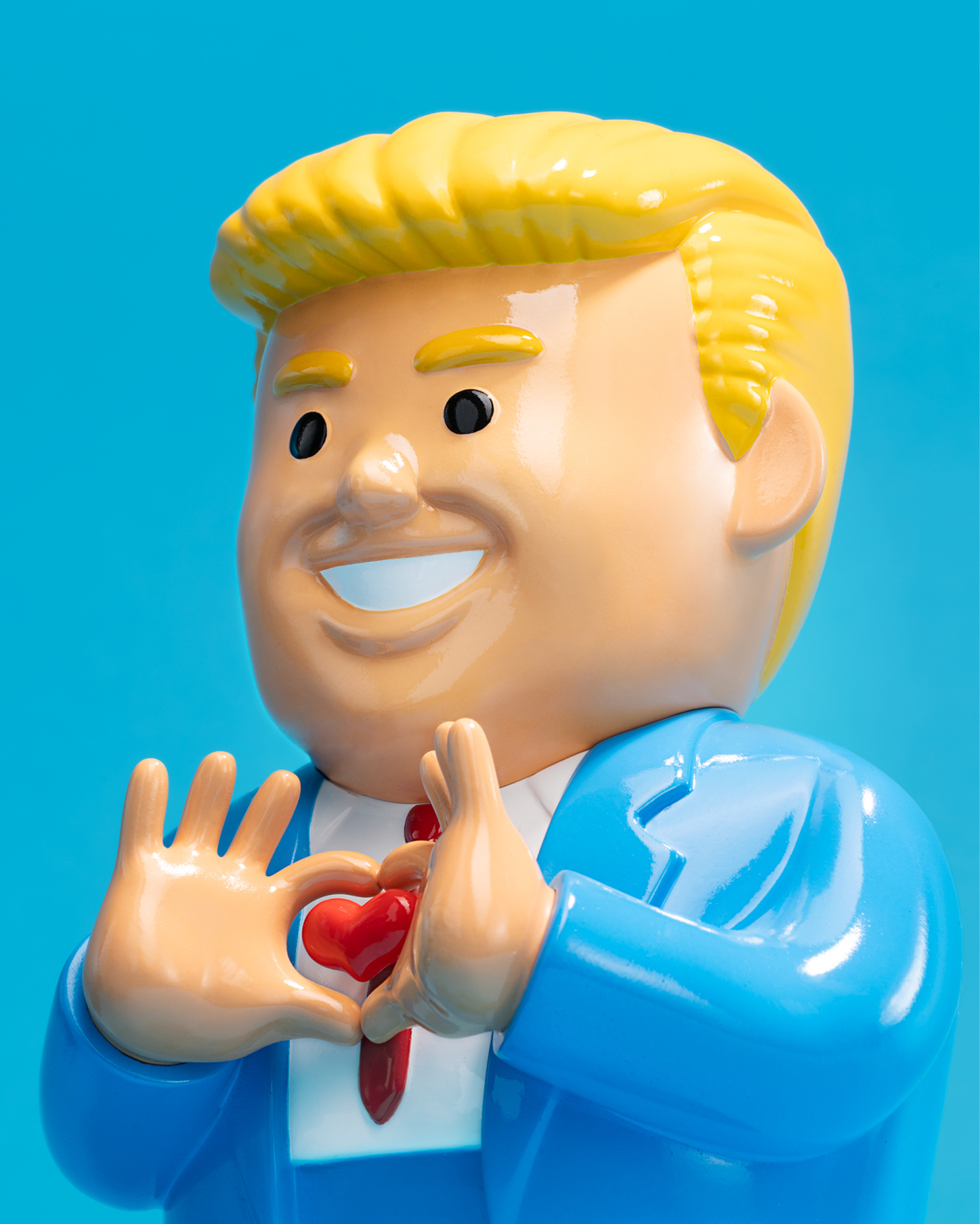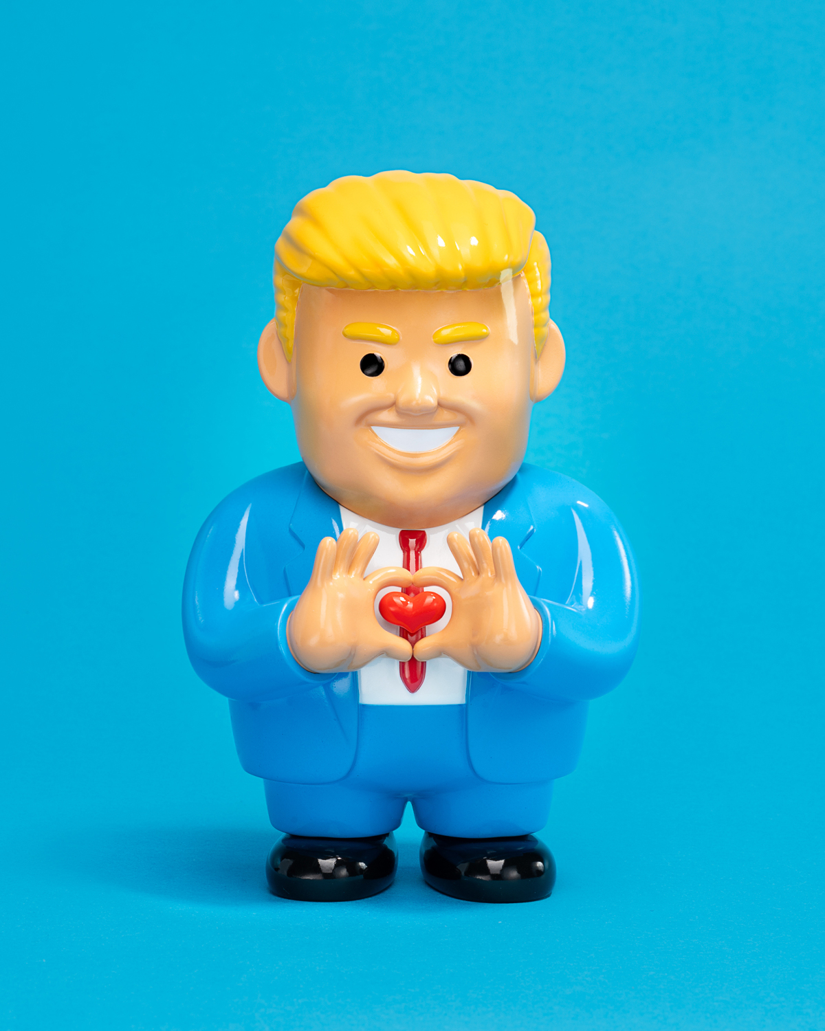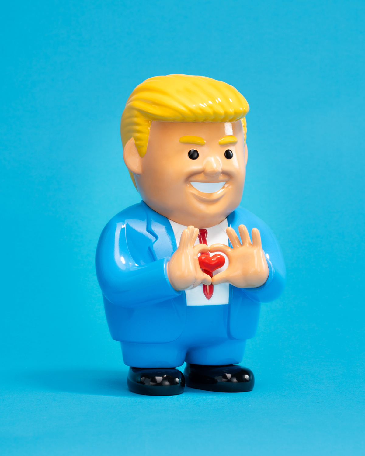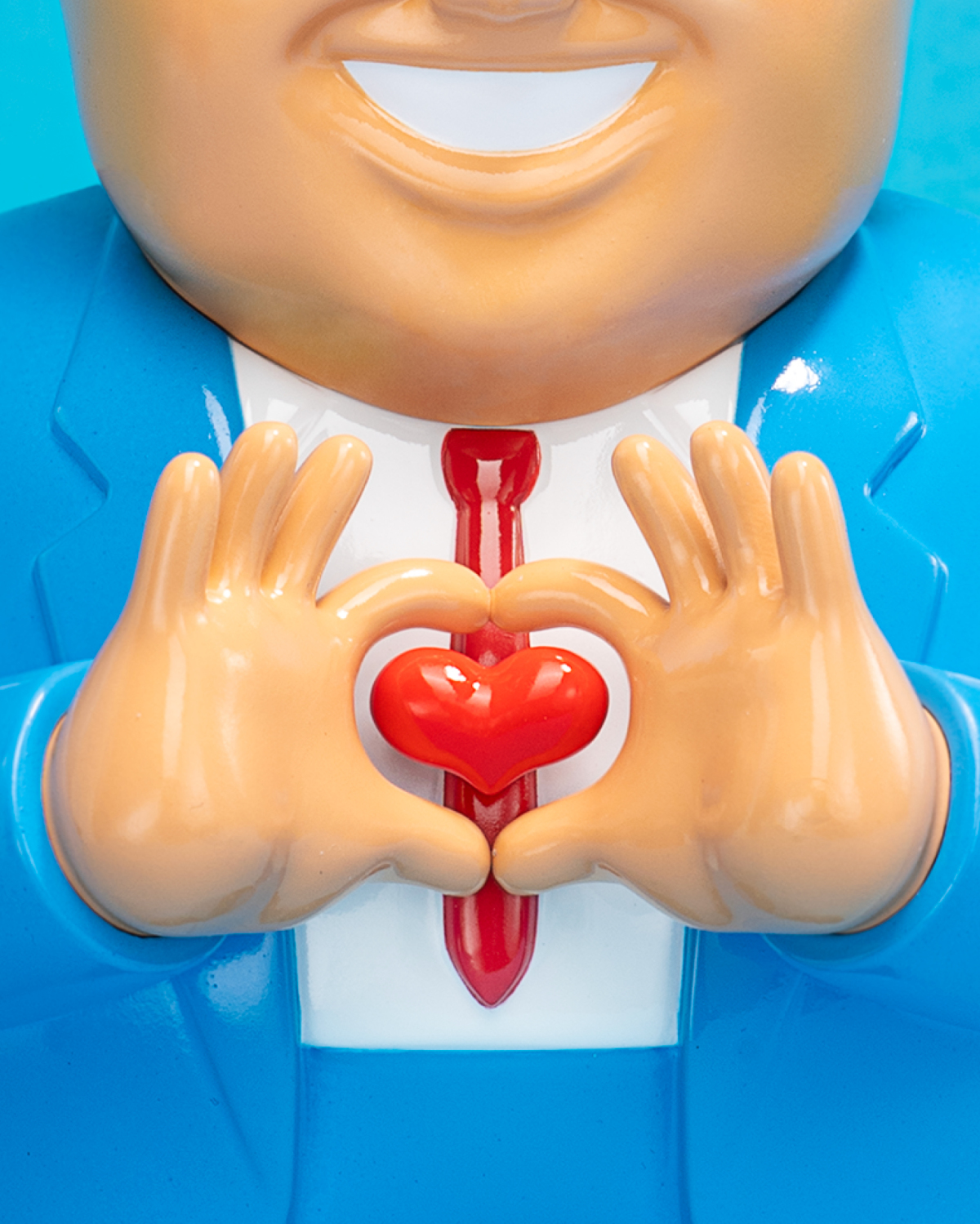 全新推出的6.8吋搪膠公仔,JOAN CORNELLÀ透過極具辨識度的「西裝紳士」形象,融入他詭譎風格。全新作品刻畫岀一位身型胖胖、帶着一頭金髮、身穿西服紅領帶的男人,雙手比着愛心手勢來示愛。延續以往的黑色幽默風格,這枚怪誕的作品加上雙手交疊的示愛姿態,形成一種既荒誕又引人深思的奇特的反差。
