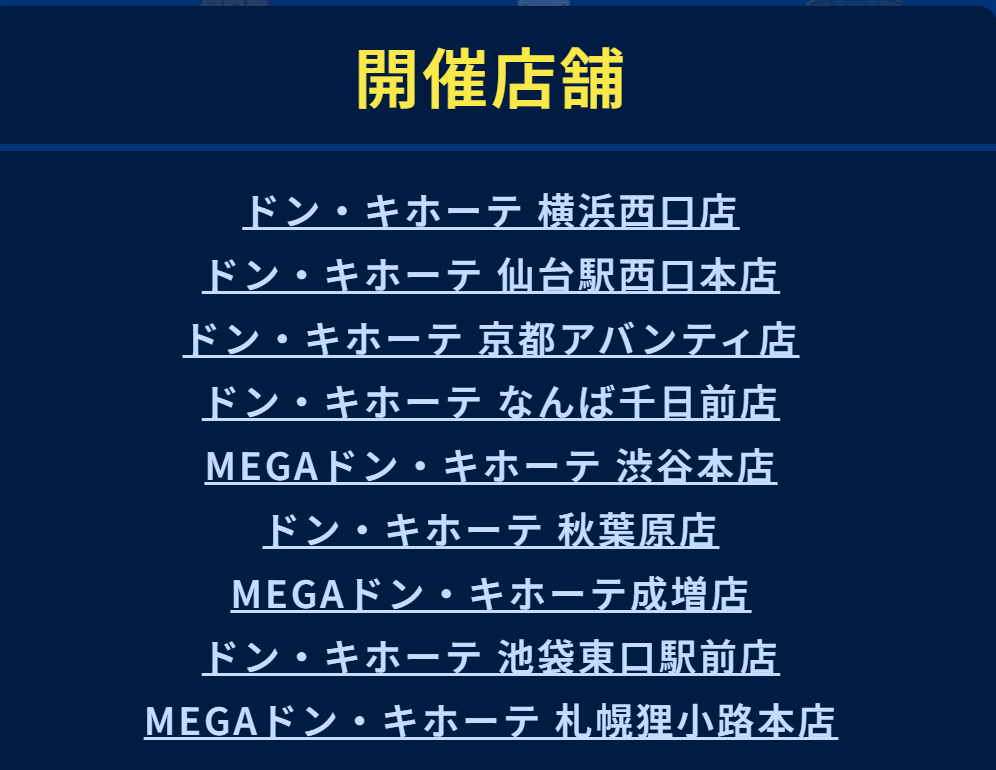 門市包含 : 橫濱西口店、仙台站西口本店、京都 AVANTI 店、難波千日前店、MEGA 澀谷本店、秋葉原店、MEGA 成增店、池袋東口站前店與 MEGA 札幌狸小路本店。