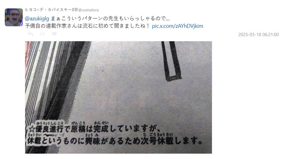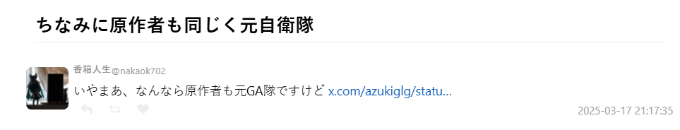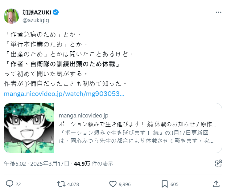 X 上就有推主發文,表示「因作者生病暫停連載」、「因忙於單行本作業暫停連載」、「因生產暫停連載」這些理由倒是常見,但是「因作者要去自衛隊訓練暫停連載」,這還是頭一次聽到啊!而且這才知道,原來作者是預備自衛隊成員!?