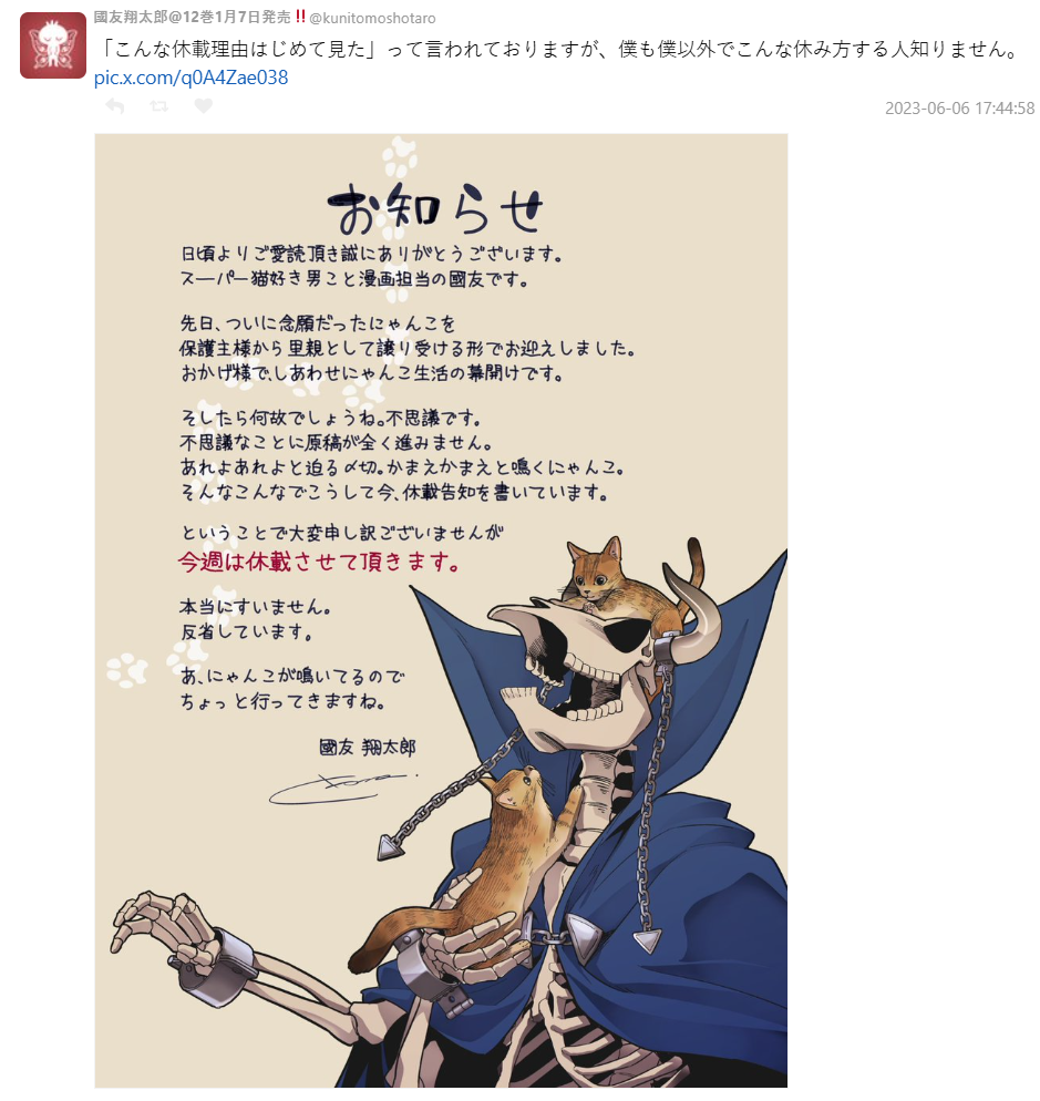 這也讓網友整理出過去一些奇怪的休刊理由,像是過去我們介紹過的漫畫家國友翔太郎,就因為「照顧領養的流浪貓」為由決定休刊一週,也讓不少網友印象深刻。