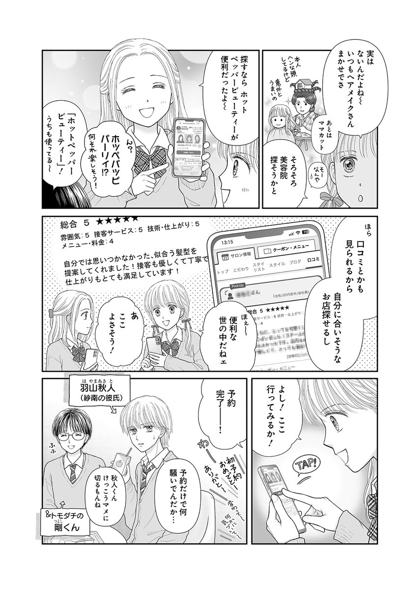 當然為了宣傳 Hot Pepper Beauty,也在漫畫中讓角色拿出手機預約的 App,透過這款服務找到適合的髮型沙龍,剪髮、護理。當然讓人不得不在意的,就是在旁邊的喝飲料的羽山秋人,還特別標註「紗南的男友」。