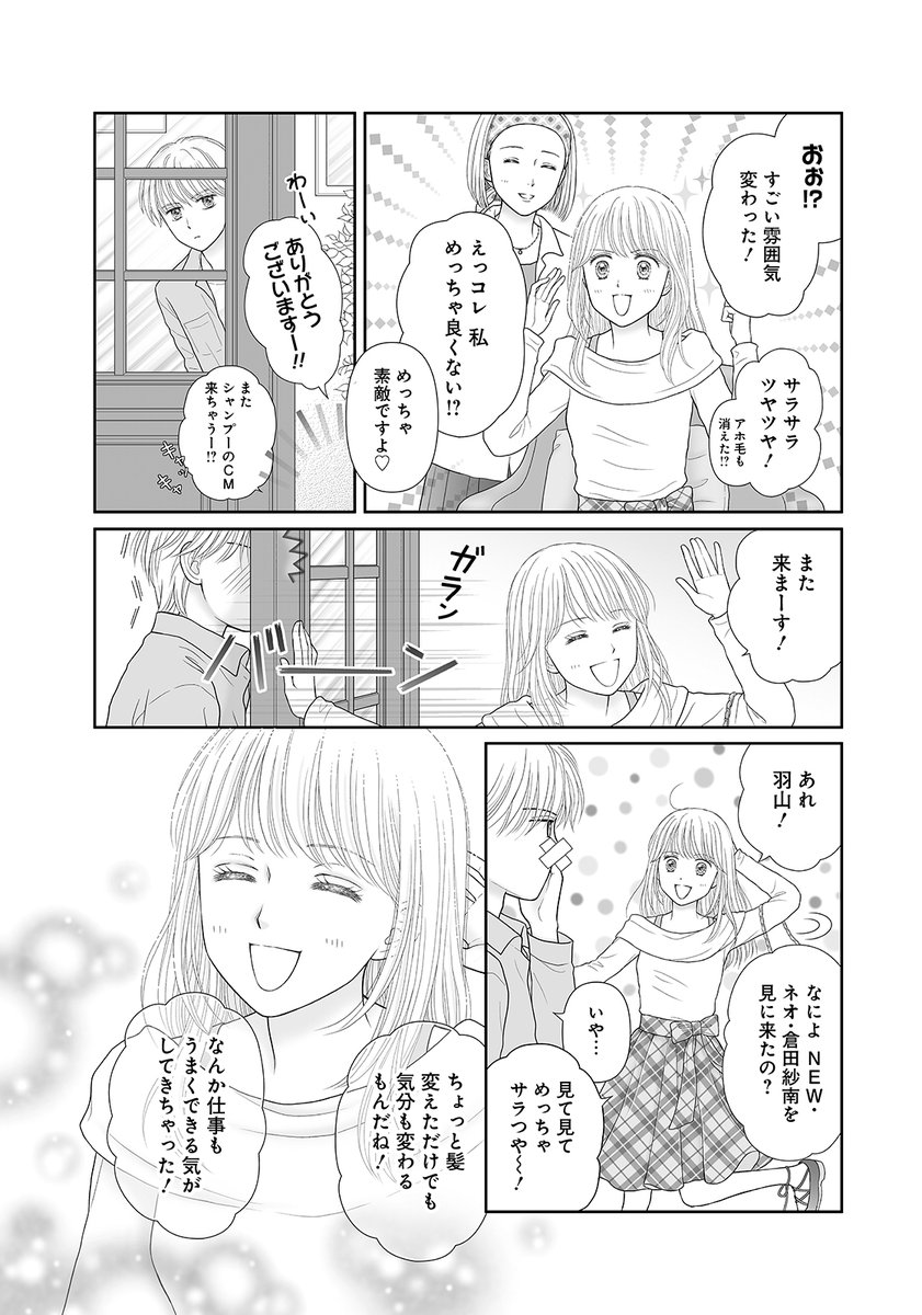 後續前往美容院的紗南,也轉變了自己想要的煥然一新造型,男友羽山也在店外偷偷觀看店裡的紗南,一如過往冒失的紗南不小心開門撞上了羽山。