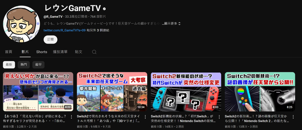 レウン經營的 YouTube 頻道也非常厲害,擁有 33 萬訂閱且時常介紹任天堂遊戲相關資訊,各位有興趣不妨也可以去逛逛。