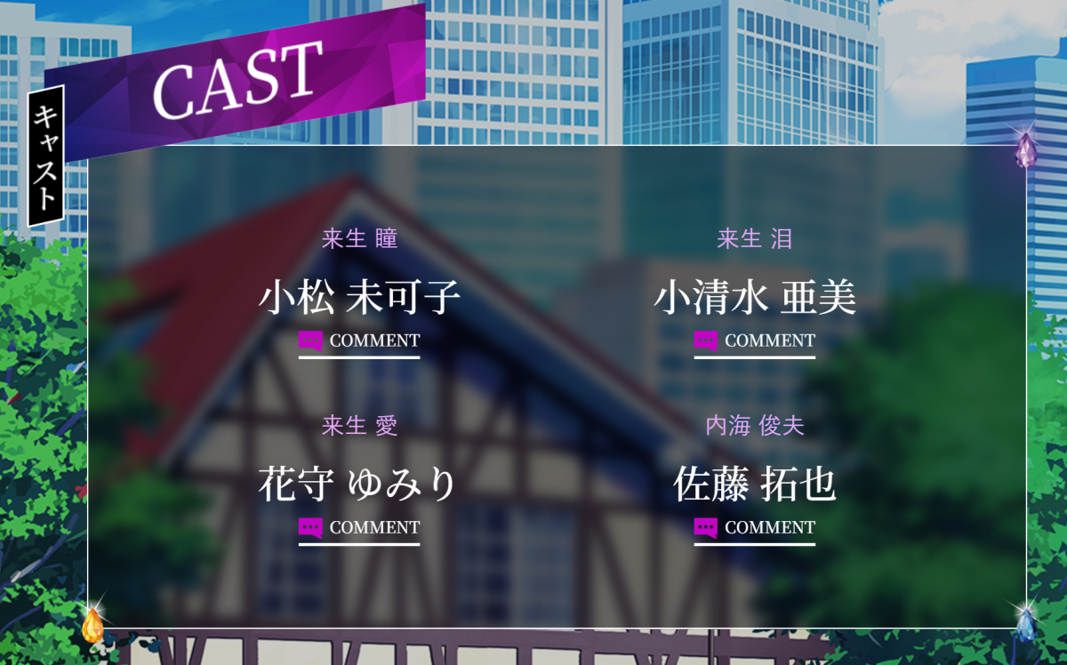 聲優部分,來生瞳由配音過《咒術迴戰》禪院真希的小松未可子演出;來生淚則配音《狼與辛香料》赫蘿的小清水亞美擔當;來生愛則為《輝夜姬想讓人告白》早坂愛配音花守由美里負責。內海俊夫則由佐藤拓也配音。