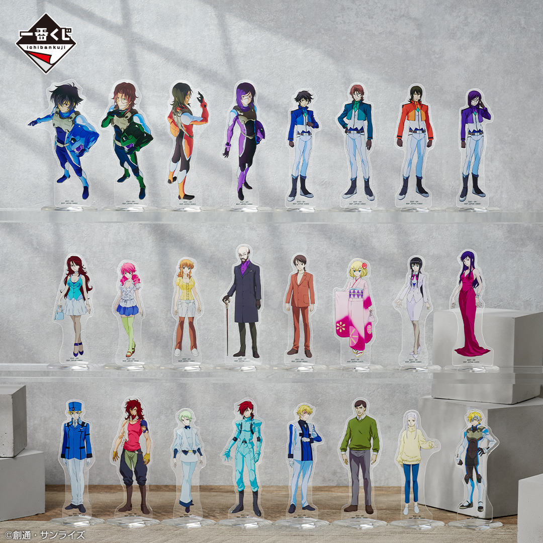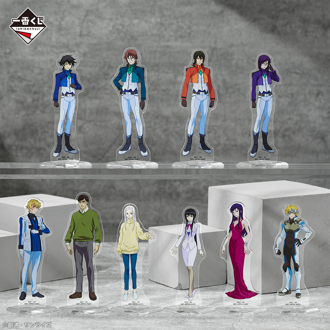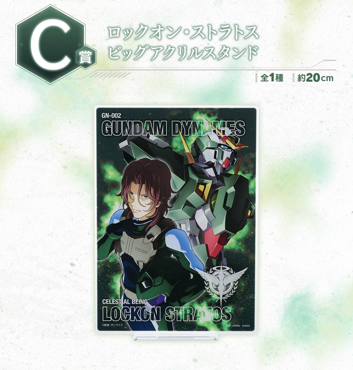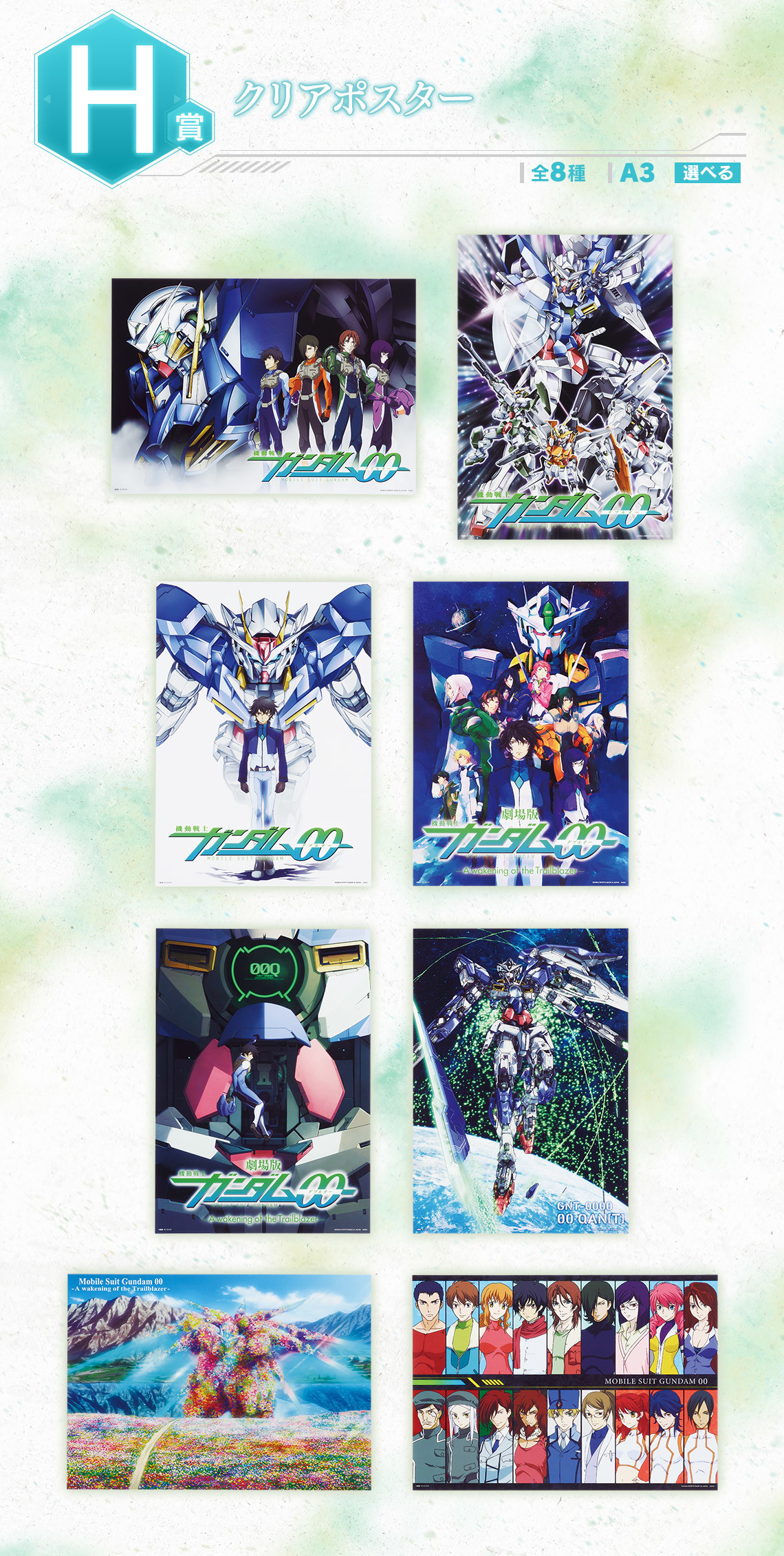 此次「機動戰士鋼彈00 -GUNDAM MEISTERS-」的獎項將聚焦於劇中登場角色以及第一季天上人投入的四架鋼彈機體,推出壓克力立牌、橡膠杯墊、透明海報等多種週邊。其中最大獎「A賞」造型,將推出劇中由主角剎那·F·塞耶所駕駛的機體「MASTERLISE MECHANICS 能天使鋼彈」不可動模型,擁有全高約 22 公分尺寸、高密度的裝甲細節刻畫、機身標誌印刷,並再現右臂主武器「GN劍」的帥氣造型,而最後賞也推出使用金屬紅等色彩塗裝的「TRANS-AM」版本。