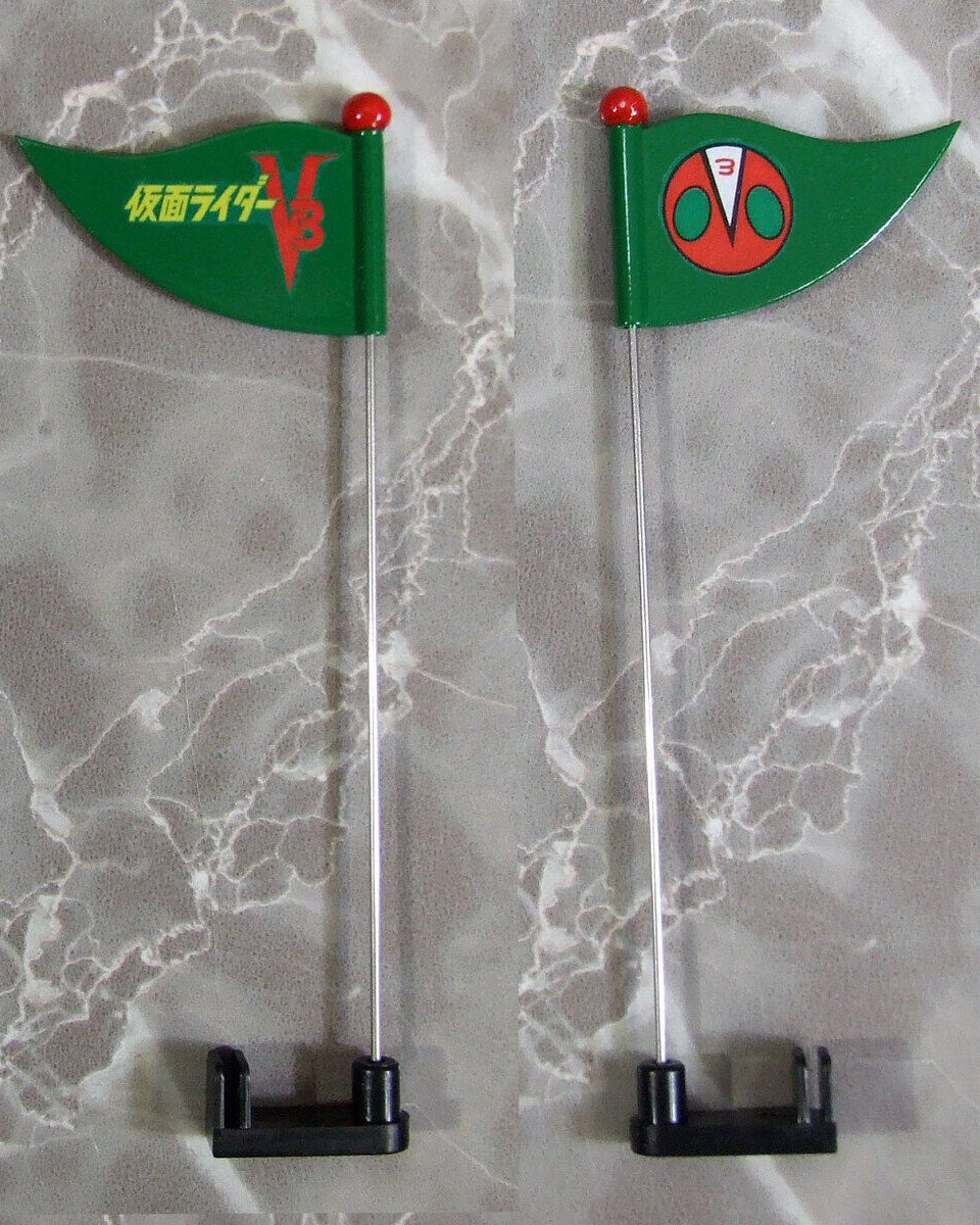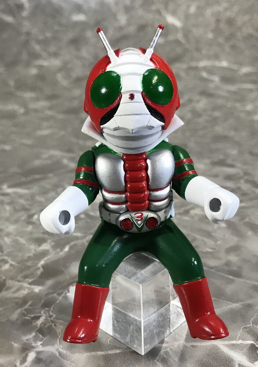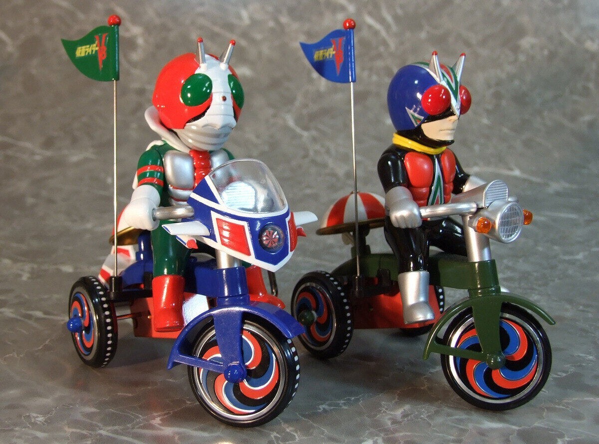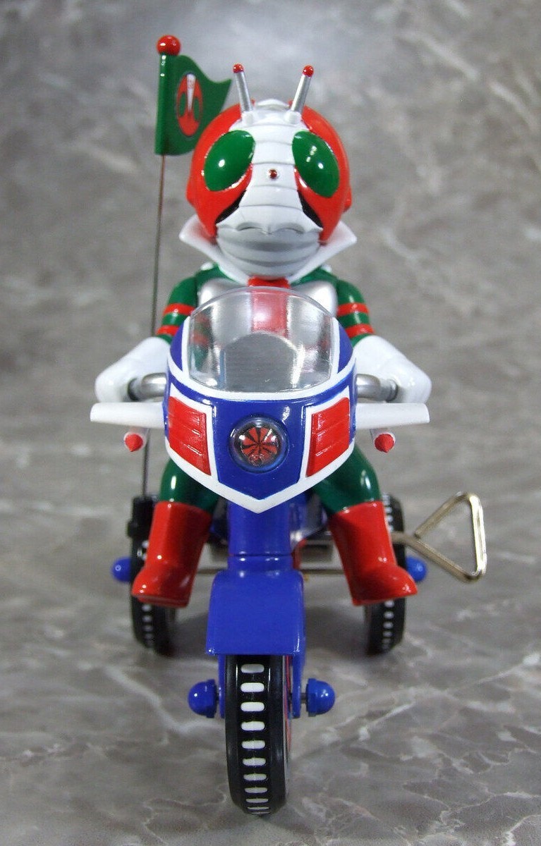 「EX 三輪車 假面騎士V3 A Type」,馬口鐵製的發條三輪車加上假面騎士V3!除了Q版的假面騎士V3之外,三輪小車車也注入招牌摩托車颶風號的設計,整體充滿復古童趣!尺寸高約135mm、長約145mm,雖然變形為可愛的風格,但還是透過細節刻劃展現角色的特點。車身的引擎蓋和車燈採用透明零件重現;三輪車的車身、車輪、鈴鐺等都施以標誌性的配色,讓粉絲們著迷!轉動發條,三輪車會緩緩向前移動,輪子也是可動的,可以透過改變前輪的角度來改變行進方向,鈴鐺部分也會發出叮噹鈴聲!還附有可以插在車上的小旗幟,超級可愛~