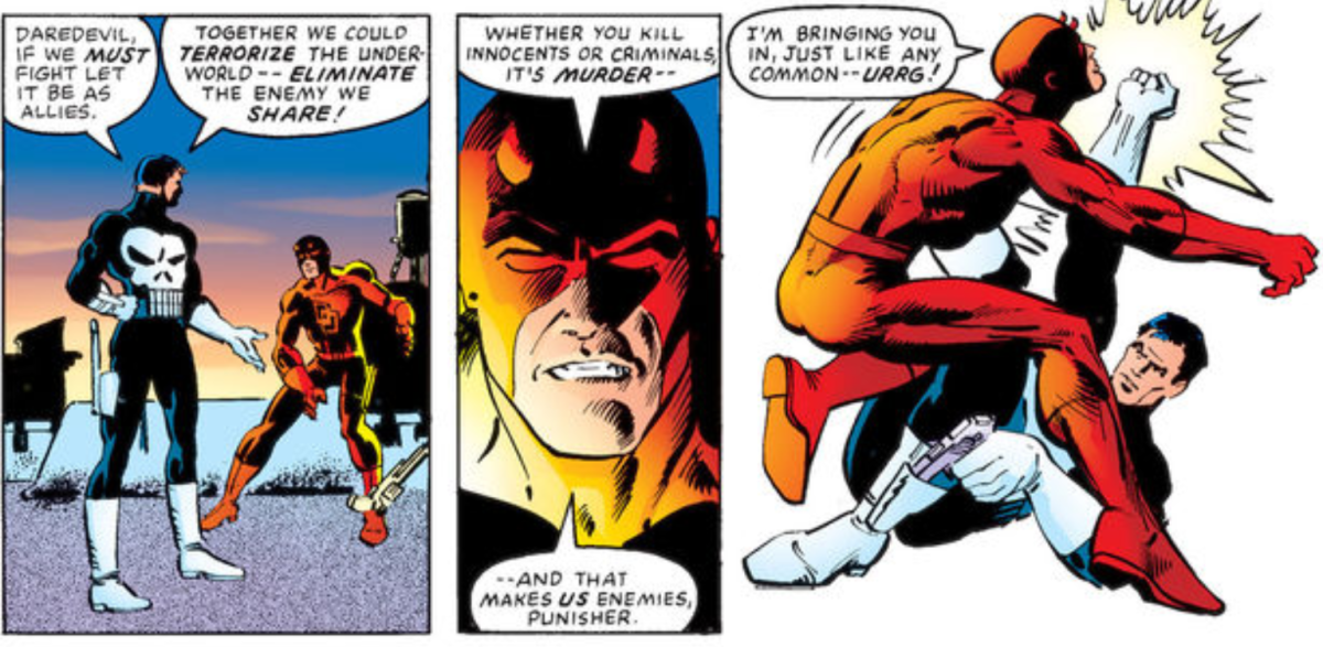 不論在漫畫還是影集中,夜魔俠與制裁者只要一碰上,不是在對立就是在直接開打,因這兩個角色正好各自代表了在黑暗世界中尋求正義的兩種極端信念,雖然同樣是在打擊犯罪,夜魔俠在戰鬥中也從不手下留情,但對比制裁者只想殺光這世上所有的罪犯,毫無道德底線可言,夜魔俠的戰鬥方式常帶有強烈的道德約束感,總是力圖避免殺死對方,在相信報應的同時,他也相信法律實踐正義的力量,認為罪犯最終應受到司法的制裁,而每次與制裁者的對立,對於夜魔俠而言都是一次又一次的挑戰,不斷考驗著自己在磨難中,能堅持「不親手殺死罪犯」的信念到什麼程度?