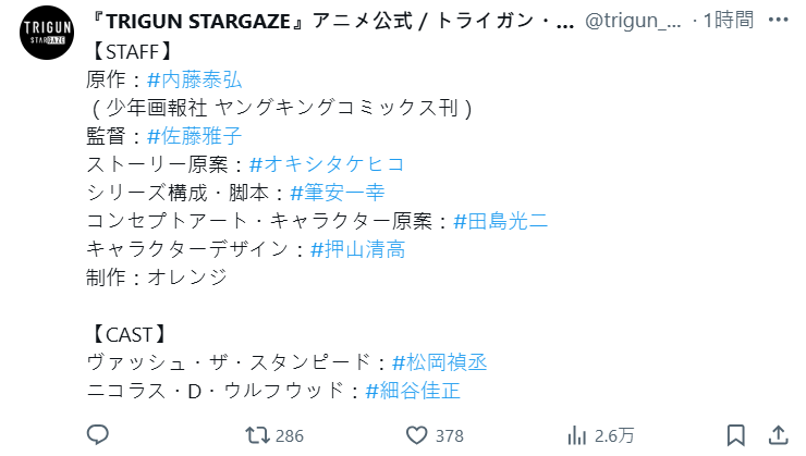 導演換成過往多擔當分鏡工作的佐藤雅子,系列構成則換成負責《異種族風俗娘評鑑指南》編劇的筆安一幸來擔綱;然而人物設計更是找來《驀然回首》導演押山清高,看來這次官方對《TRIGUN STARGAZE》的確希望有煥然一新的氣象。