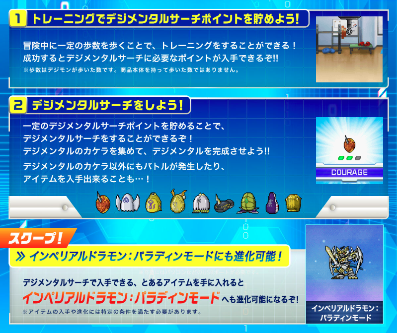 遊戲收錄了華麗的影像演出與經典的劇中樂曲、角色語音,以全彩的畫面演出動畫中數碼獸的進化場面,同時播放『Break Up!』、『Brave Heart!』等熱血的進化背景歌曲。隨著遊玩進度,玩家能夠收集到「數碼裝甲」的碎片,最終完成後便能讓搭檔數碼獸進行「裝甲進化」。此外也再現了「V仔獸+蟲蟲獸=機甲龍獸」等合體進化姿態,甚至能進一步進化為「帝皇龍甲獸」、「帝皇龍甲獸:戰鬥型態」、「帝皇龍甲獸:聖騎士型態」。