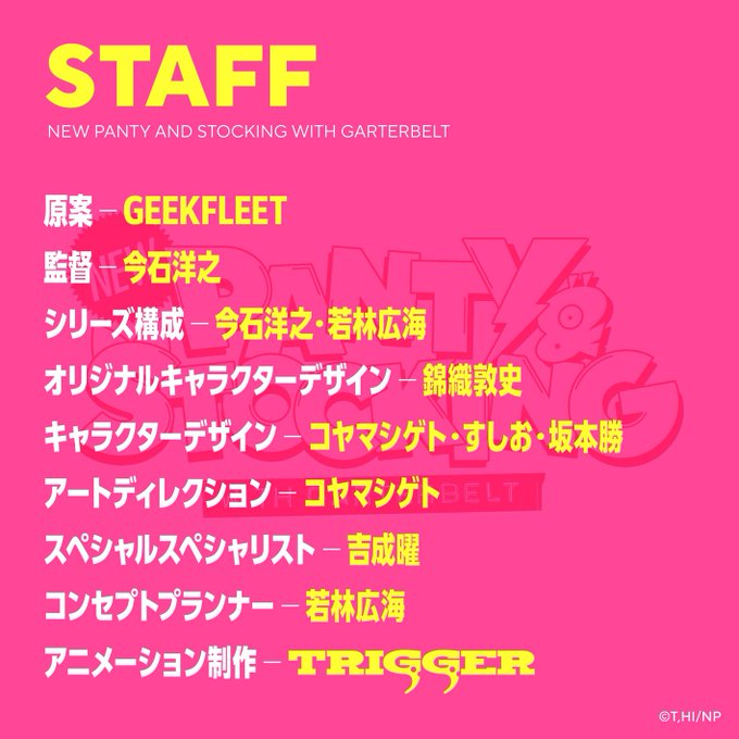 暱稱「扳機社」的動畫公司 TRIGGER 在去年的洛杉磯 AnimeExpo 2023 宣布動畫《吊帶襪天使》(Panty&Stocking with Garterbelt)已從 GAINAX 取得原作版權,確定將有新作動畫製作,今年 7 月也確定新作動畫標題為《新吊帶襪天使》( 暫譯,New PANTY&STOCKING with GARTERBELT )。