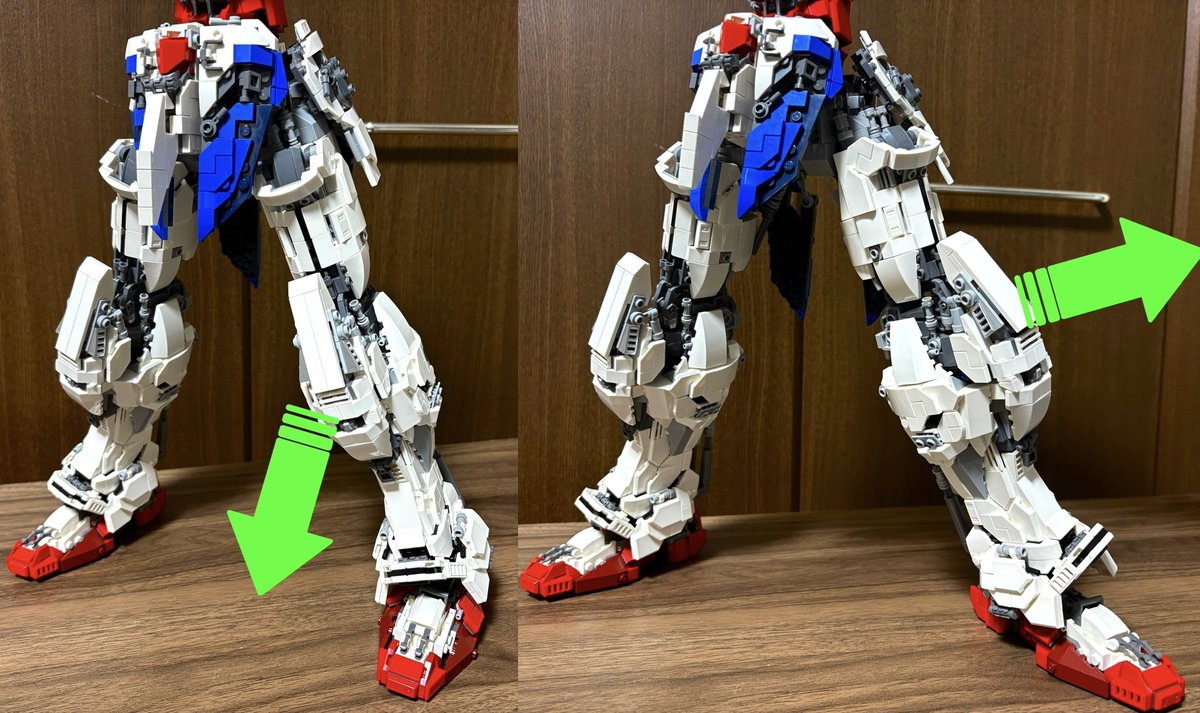 此外這次需要挑戰的,就屬腿部的關節活動程度。將大腿的可動範圍具有 XYZ 軸的可動範圍,旋轉上也能夠呈現神鋼彈的活動姿態。膝部裝甲會隨著彎曲而連動移動,腳踝跟大腿一樣具備 XYZ 軸可動,同時也擁有能支撐全身重量的強度。