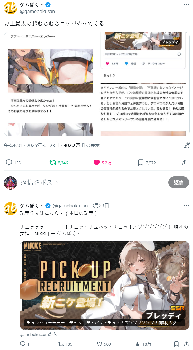 引起網民討論的是這位日本部落客「ゲムぼく。」的發文,看看這個角色的超絕肉感身材,繪師更是精細的把「肉肚肚」畫得生動又有質感,除了肚子讓人無法忽視外,肉肉的大腿也很符合現今的 ACG 粉絲癖好,更不乏海外網民也來關切這個角色是何方神聖。