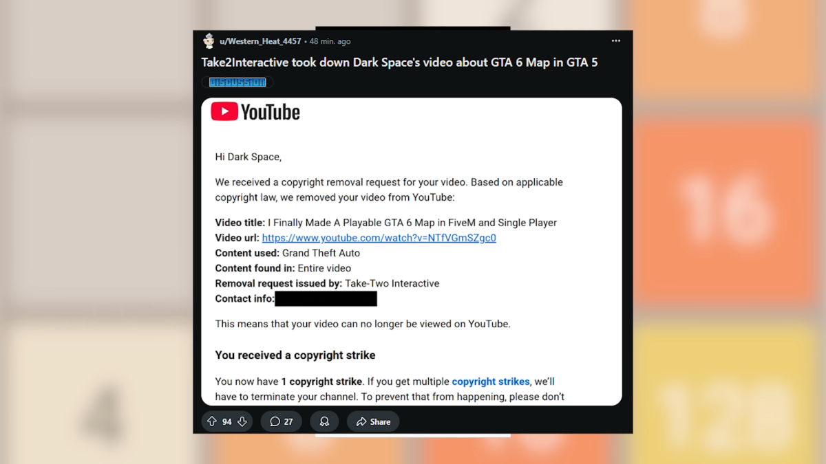 據報導,Dark Space在YouTube頻道上展示了這款模組的遊玩畫面,並免費提供下載。模組發布後迅速引起玩家關注,許多粉絲藉此一睹《GTA 6》的可能樣貌。然而,Take-Two近日向YouTube提出版權申訴,要求移除相關影片,並成功讓該內容下架。由於YouTube頻道若累積過多版權警告可能會被關閉,Dark Space也選擇主動刪除所有下載連結,結束該MOD製作。