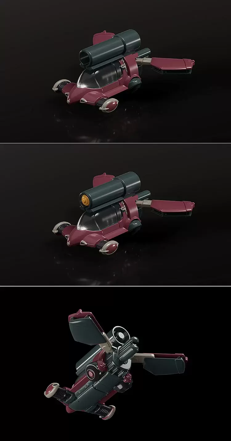 各部關節具備靈活的可動機構,背部機翼則能藉由替換零件方式再現收納、展開兩種狀態,同時背包還具備電池交換機構,能將內附的兩個電池零件裝填。此外商品還將附上卡爾曼99的懸浮機車「雷霆」作為額外零件,同樣能夠安裝電池零件。