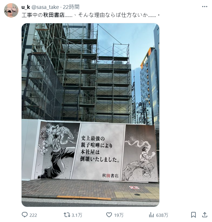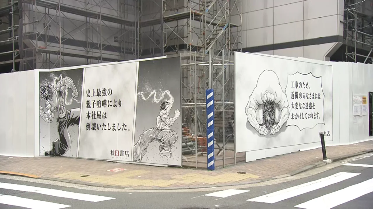 身為日本知名的出版社之一的秋田書店,近期總部大樓因為翻新正進行施工,沒想到在施工現場的圍欄上,特別以自家出版的人氣漫畫《刃牙》的經典場景「地上最強的親子打架」為主題,來場別出心裁的創意擺設。