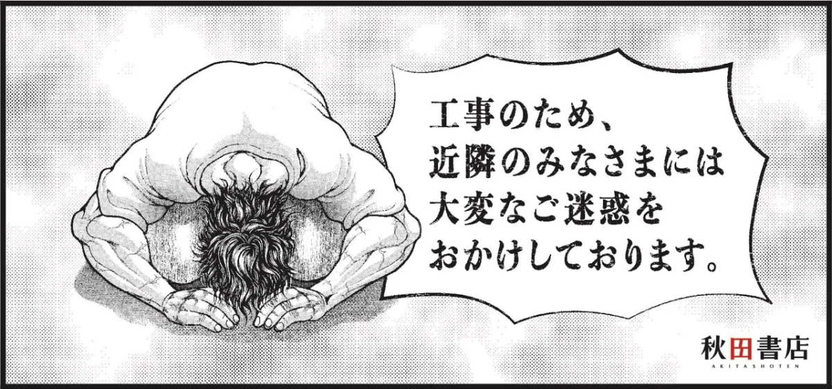 而秋田書店的代表取締役社長山口德二也表示:「由於大樓老舊,這次的拆除勢在必行,過程中可能會帶來一些不便,敬請見諒。但如果大家能想像這道圍牆後,正在上演範馬家的最強對決,或許就能稍微享受這片施工場地的風景……嗯,不過這可能只是我們一廂情願的想法啦!(笑)無論如何,還請大家多多包涵!」