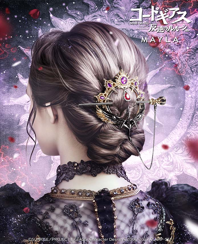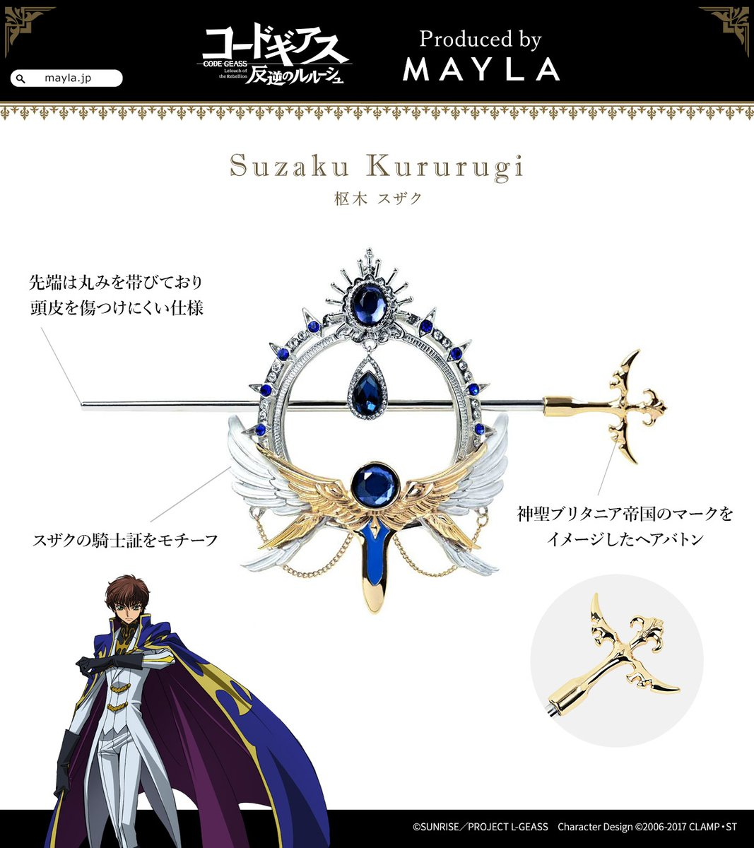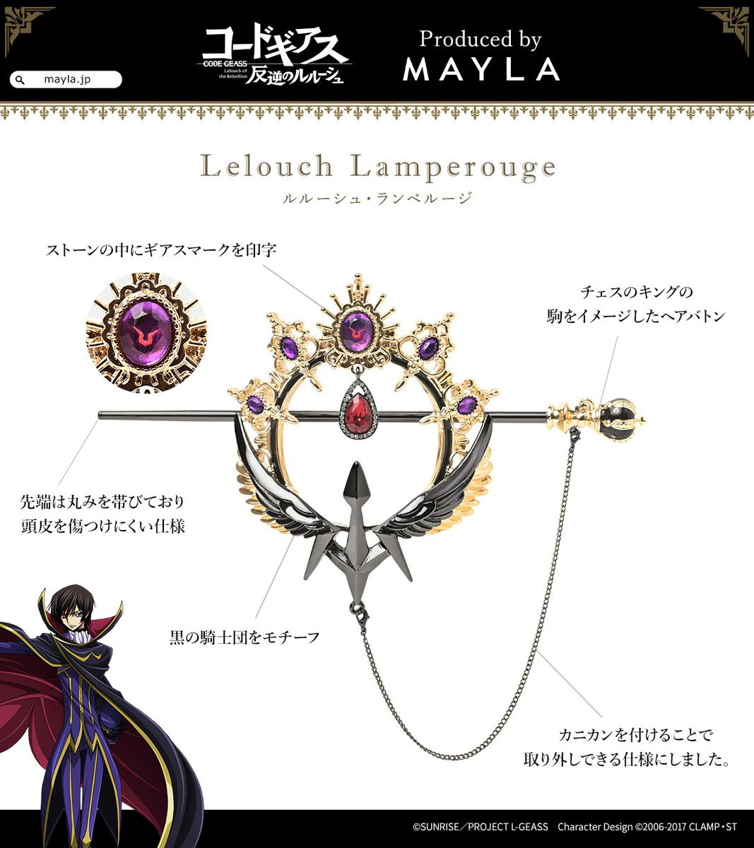 近日宣布將與人氣機人動畫作品《Code Geass 反叛的魯路修》合作,推出以兩位男角 - 魯路修·蘭佩洛基、樞木朱雀為主題的聯名華麗髮簪。售價為 12,100 日圓,目前已可於 MAYLA 官網預購。