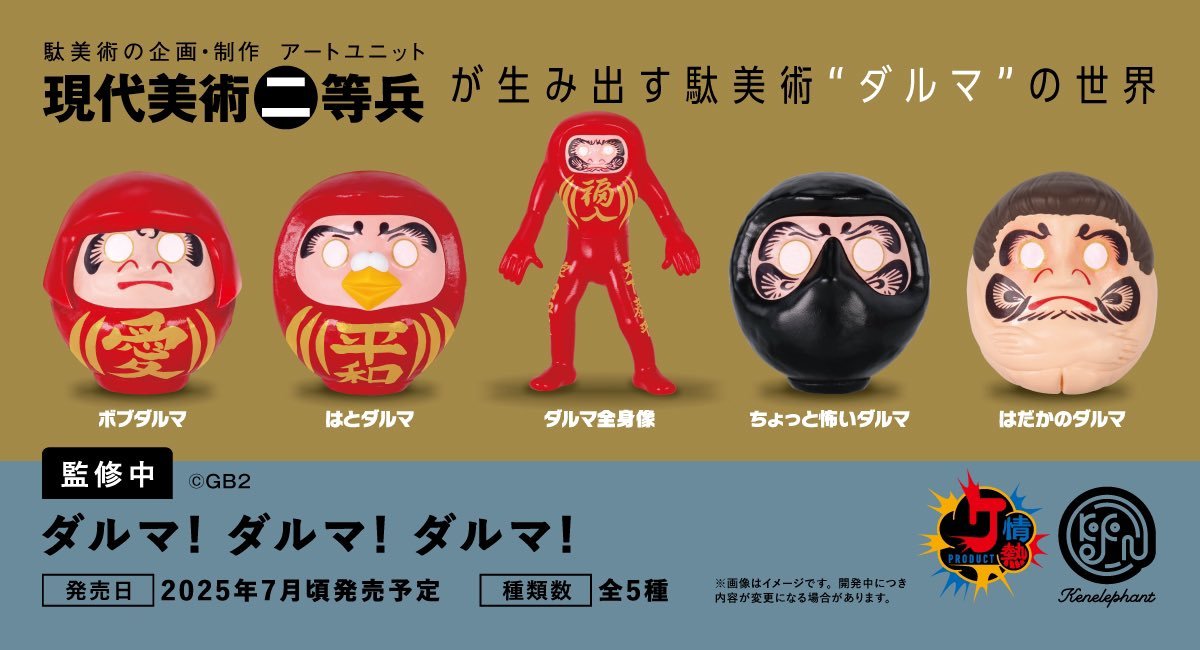 日本玩具公司 Kenelephant(ケンエレファント)公開了與藝術組合「現代美術二等兵」合作的新商品——「達摩!達摩!達摩!」,將同步以盒玩及轉蛋兩種形式發售,參考售價分別為每盒550日圓及每轉500日圓,預計於2025年07月發售!