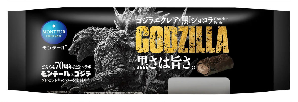 然而這次的第二彈,選用《哥吉拉-1.0》中哥吉拉漆黑的形象,更進一步將哥吉拉化為「黑色系甜點」,以黑暗巧克力為口味推出兩款泡芙,展現出哥佬僅有的黑色王者甜點。