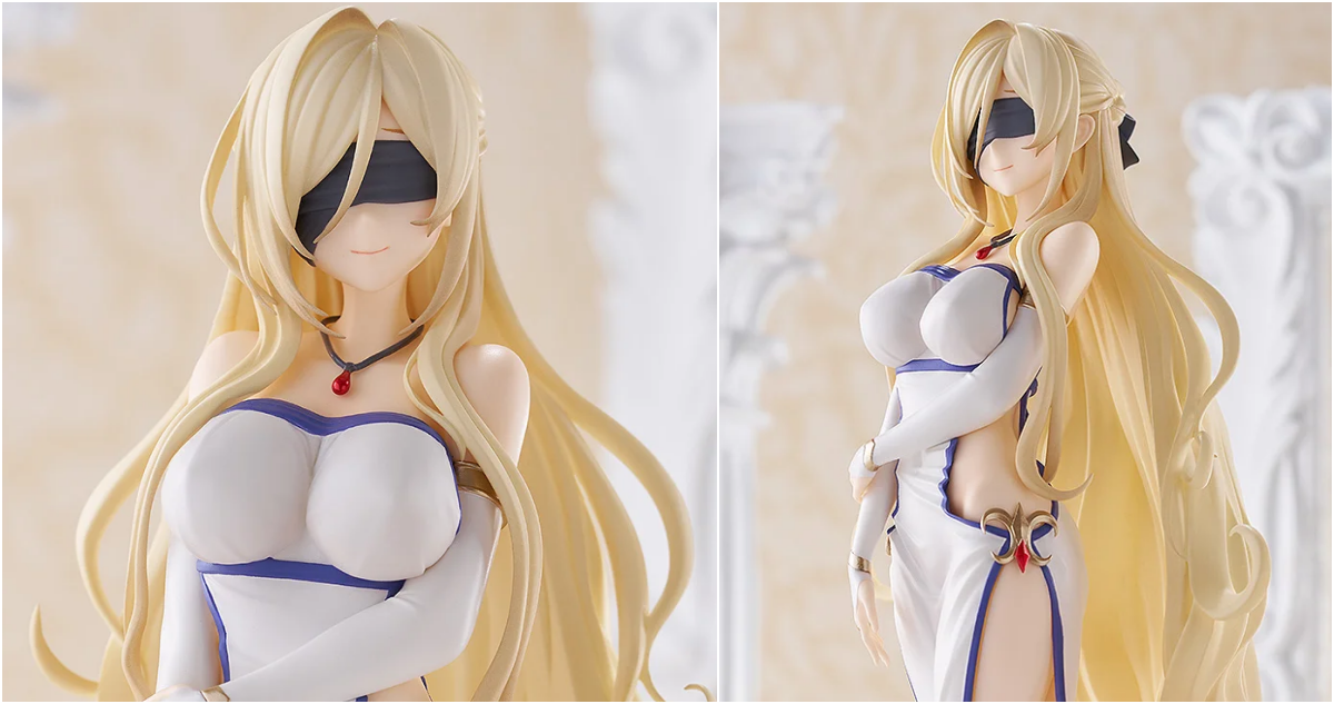 「POP UP PARADE 劍之聖女 L size」無比例 PVC 塗裝完成品,尺寸約高 24 公分,將聖女金色的過膝長髮、因視力受損而用黑色布條遮住的雙眼等特徵還原;包覆豐滿身軀的白紗,勾勒出肉感的雙峰並露出腰部、腿部等優美的線條,性感身材一覽無遺!點綴有鑲嵌紅寶石的華麗金飾。生動的姿勢刻劃,即使表情受黑布遮蓋,也能感受到嬌羞的氛圍~