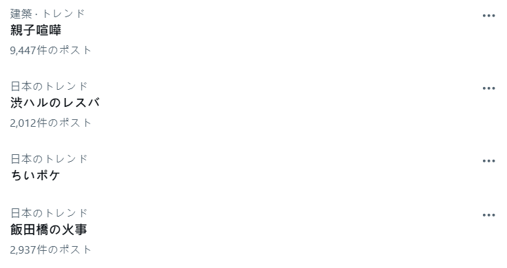 ▼ 相關詞彙「飯田橋の火事」&「親子喧嘩」也成為今日下午日本 X 趨勢熱搜。