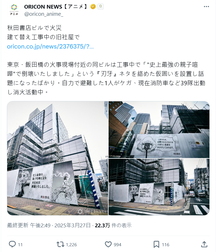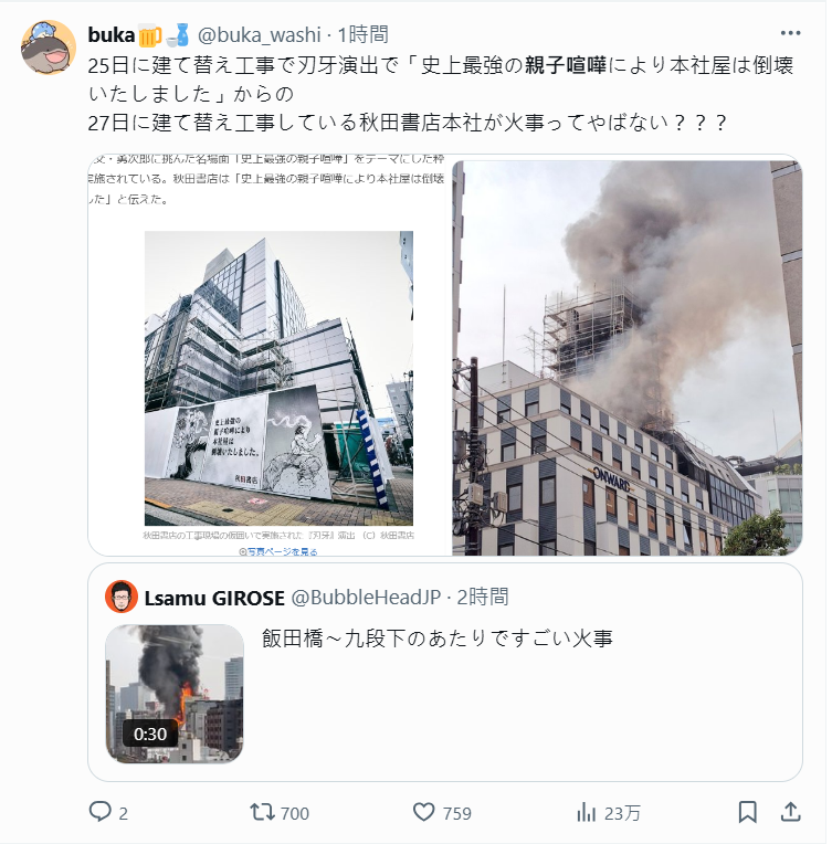 沒想到今日 ( 3/27 ) 下午據多家媒體報導東京千代田區飯田橋一帶發生大樓火災,起火地點疑似為正在重建中的秋田書店舊總部大樓。這也讓不少粉絲憂心,沒想到親子打架真的成了災難嗎...。