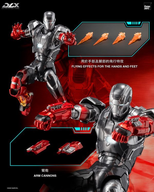 本次的DLX「鋼鐵人馬克XXII 復古改裝車」高約17.5公分,以threezero著名的DLX壓鑄技術製成,內藏精細的合金骨架,全身做有48處可動,雕刻再現了他近似鋼鐵愛國者的流線造型,並細膩的還原火焰花紋塗裝,眼睛和胸口的反應爐皆作有LED發光功能,可以搭配靈活可動展示如銀幕上的效果!配件部分附有又5左4種替換手型、臂炮以及手腳的推進器特效件,threezero更新增了原創的配件的背炮,為它補強火力!