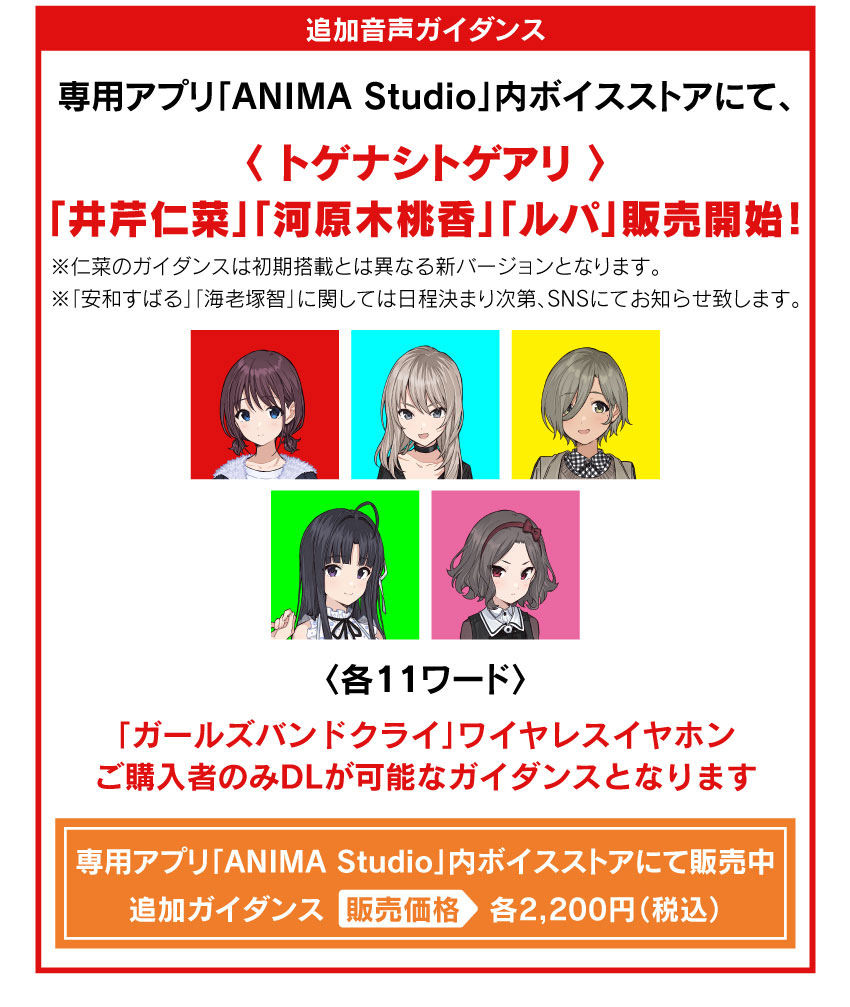 另外,使用 ANIMA 的官方應用程式「ANIMA STUDIO」就可以付費下載不同角色的語音,包含另外三位團員奈奈(CV:松岡美里)、凜(CV:漆山優希)以及愛(CV:宮白桃子)的語音。