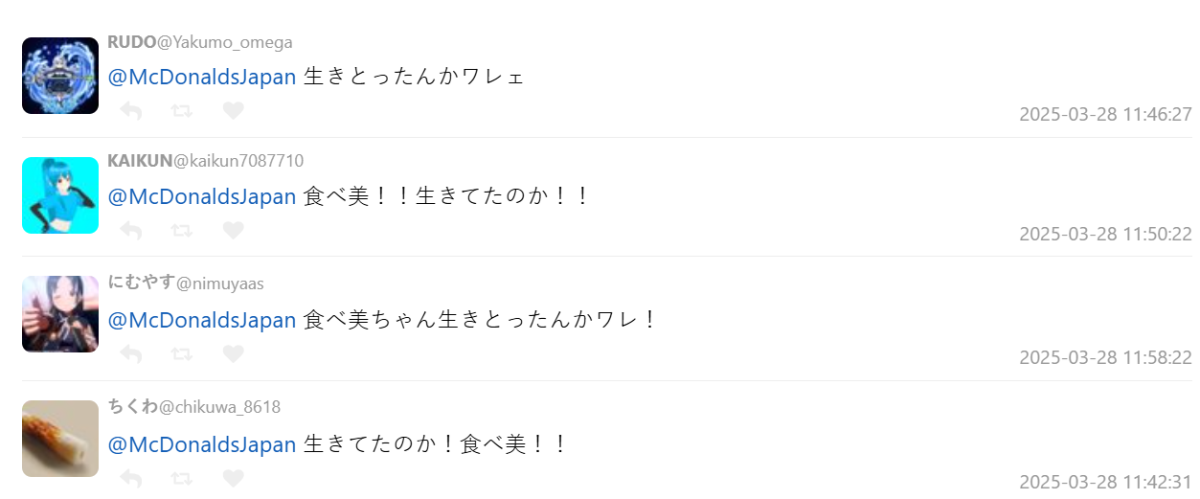 今日 ( 3/28 ) 為了宣傳睽違許久販售的「武士大麥克」系列,找回了先前人氣爆棚的宣傳角色「いまだけダブチ食べ美」,換裝成為「サムライたまご食べ美」,也同樣放上了宣傳跳舞影片,再次展現奇妙的舞蹈姿態,讓不少網友為之大笑。
