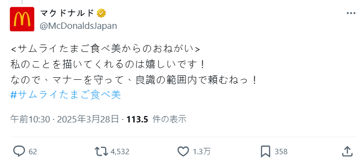 針對粉絲們的熱烈討論,官方也特別以「サムライたまご食べ美」的口吻發文提醒:「很開心大家願意畫我!但請遵守禮儀,在良識範圍內創作喔!」此舉似乎是在防範角色被畫成過於出格的二創作品(笑),看來官方有想要認真經營這個角色呢。