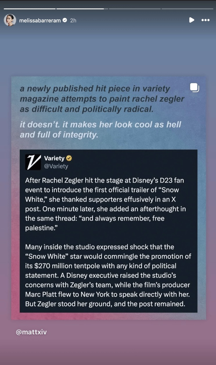 前天,《綜藝》(Variety)雜誌報導了迪士尼影業為了補救《白雪公主》(Snow White)真人電影引發的種種公關危機,而進行了什麼樣的措施。其中,報導裡提到,迪士尼去年特別震驚女主角-瑞秋齊格勒(Rachel Zegler)在 X 轉發《白雪公主》首支預告片的時候,還順道呼籲粉絲支持解放巴勒斯坦,因為他們覺得不該在宣傳電影的時候夾帶敏感的個人政治立場表態。
