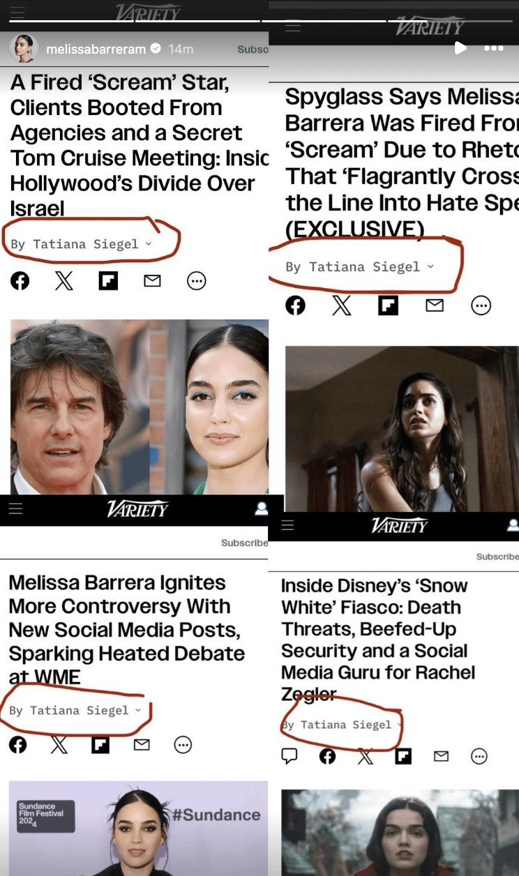 柏恩斯坦也觀察到,該篇報導的作者-塔提亞娜席格(Tatiana Siegel)在《綜藝》撰寫過很多類似的報導,包括多篇關於《驚聲尖叫》(Scream)系列第五、六集的女主角-梅莉莎芭蕾拉(Melissa Barrera,上圖)因為轉發親巴勒斯坦訊息而被電影公司開除、無法回歸第七集的事件。