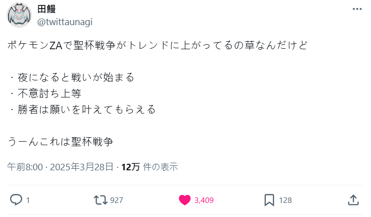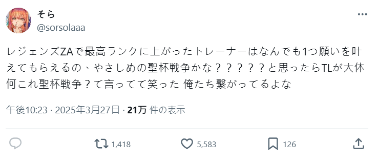其實發表會後《寶可夢傳說 Z-A》的話題就跟「聖杯戰爭」一起上了日本 X 趨勢熱搜,網友也戲稱 :