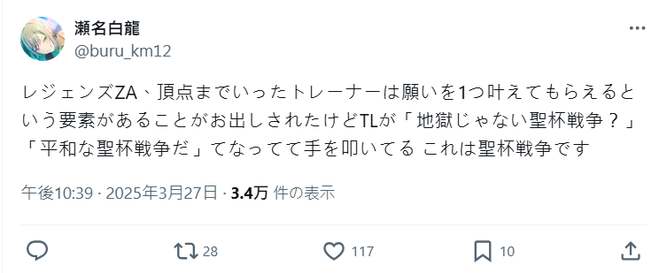 對於《寶可夢傳說 Z-A》登頂的訓練家可以實現一個願望這個設定,這不就像是比較溫和版的聖杯戰爭嗎?不少人比喻 : 「這是沒有人頭落地的聖杯戰爭?」、「世界和平版的聖杯戰爭!」。