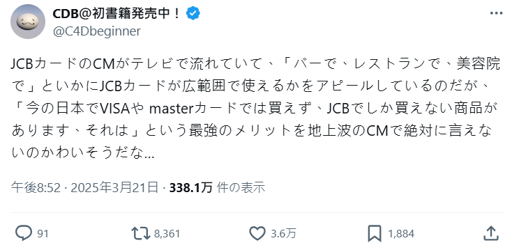 不過對於 JCB 信用卡的廣告,卻無法呈現現在在日本只有它能買、VISA 跟MasterCard 都不行的超強優勢,讓不少網友對 JCB 感到無奈,也討論起到底該怎麼宣傳才有辦法凸顯優勢。