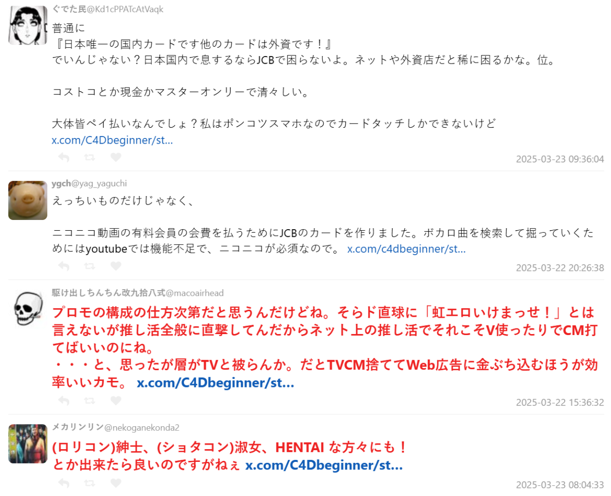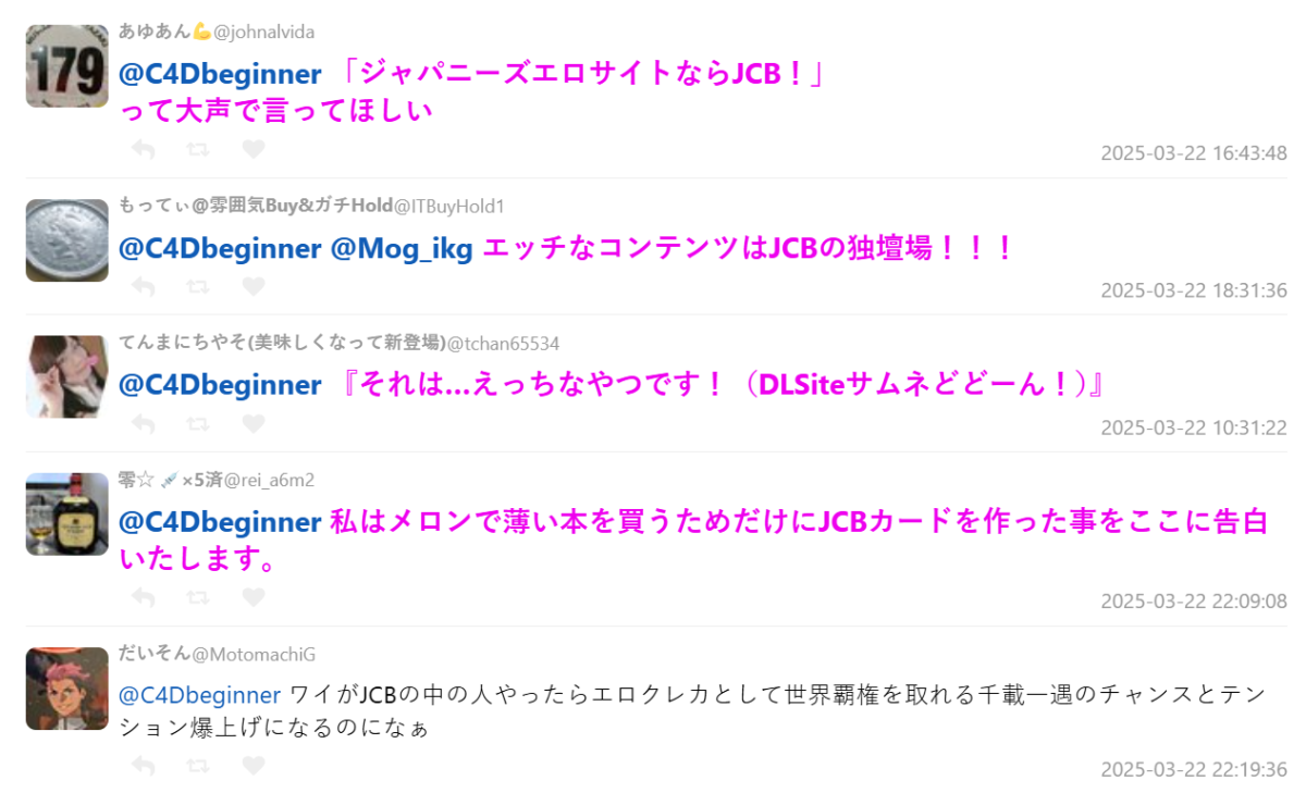其他網友也看玩笑,畢竟總不能宣傳說 : 「日本的成人網站就選JCB!」、「答案就是……色色的東西!(DLSite封面登場——!)」,也有網友指出,坦別說就是為了買 Melonbook 的本子才辦 JCB 的,真的不怕突然不能用,但現在 JCB 在成人內容市場完全是霸主級存在!