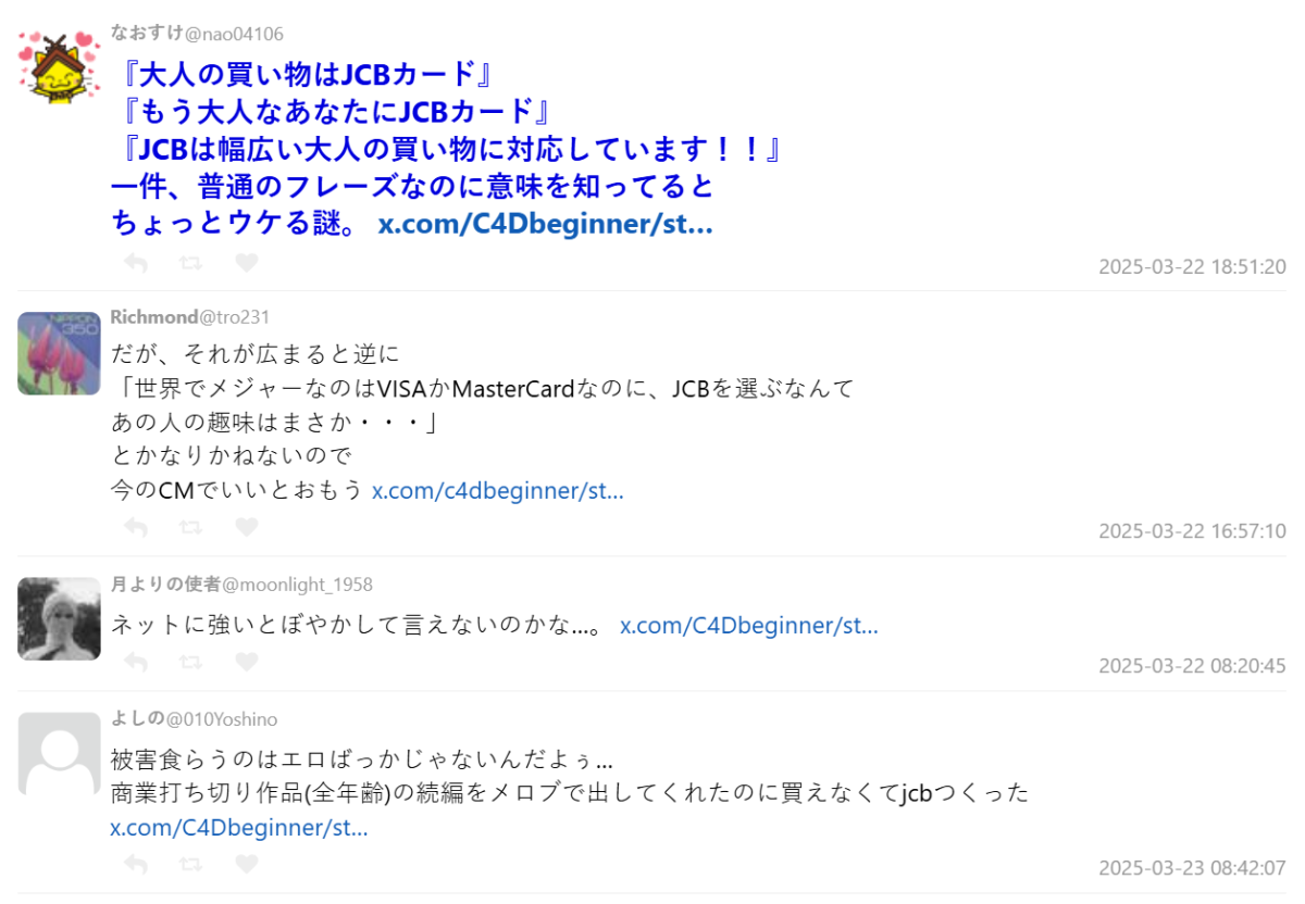 也有人建議,可以改成 : 「大人的購物就選 JCB 卡」、「成為大人的你,值得擁有 JCB 卡」、「JCB 支援各種大人的購物需求!」,反正懂得都懂,看起來都超普通,但只要知道內情,就會忍不住笑出來的那種。