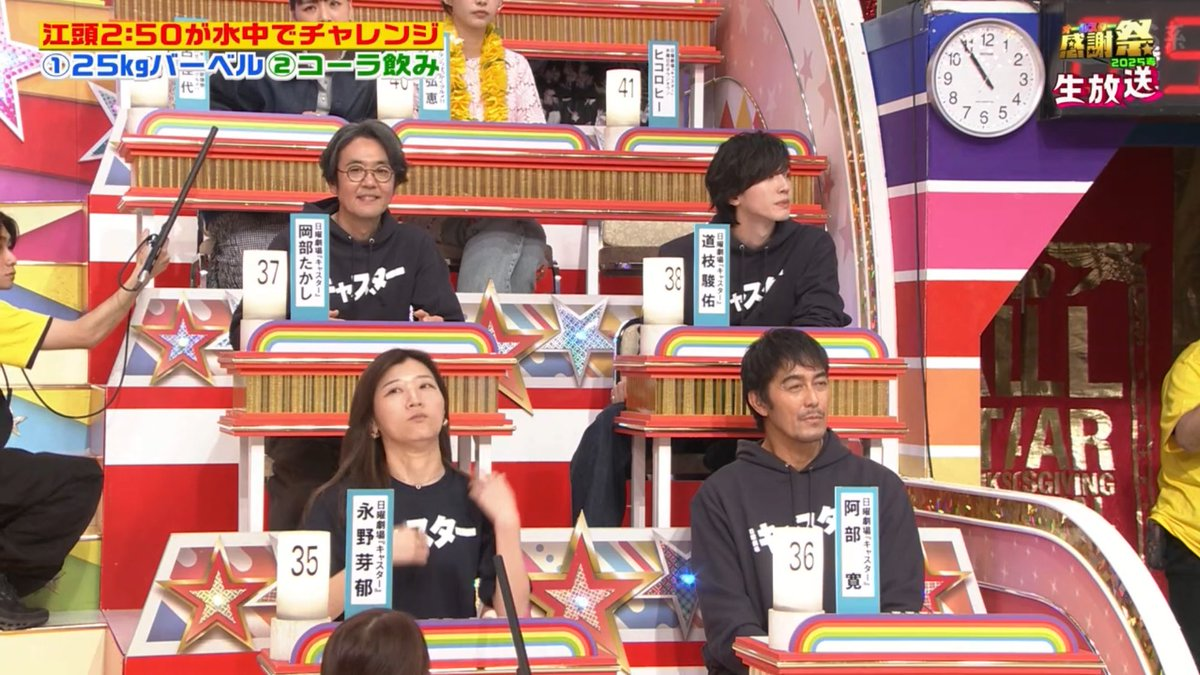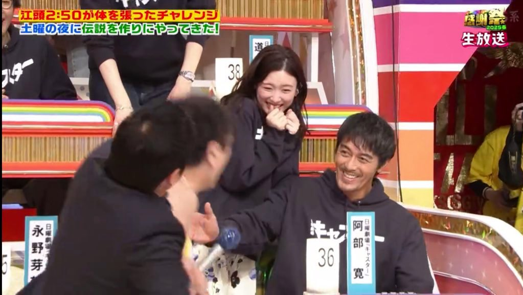 一直以來以半裸造型、猥褻形象聞名的「江頭2:50」,在節目上不僅對永野芽郁吐舌頭,大喊「做我的女人」,讓永野芽郁嚇得躲在一同宣傳新戲的阿部寬後面之外,江頭2:50甚至衝到座位區企圖襲擊,永野芽郁嚇得不敢直視甚至跑上階梯閃躲。
