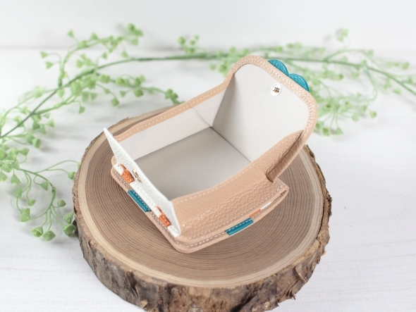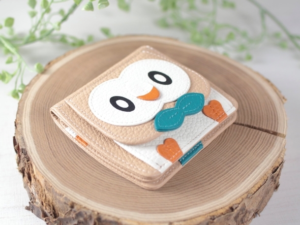 錢包整體採用木木梟羽毛般的米色皮革,正面的小零錢袋上,細膩地刻畫了木木梟的可愛臉龐與雙腳。打開鈔票夾層後,內部襯以 綠色與深橘色細節,象徵木木梟的領結與爪子,不僅充滿巧思,還帶有優雅質感,展現獨特的設計美學。